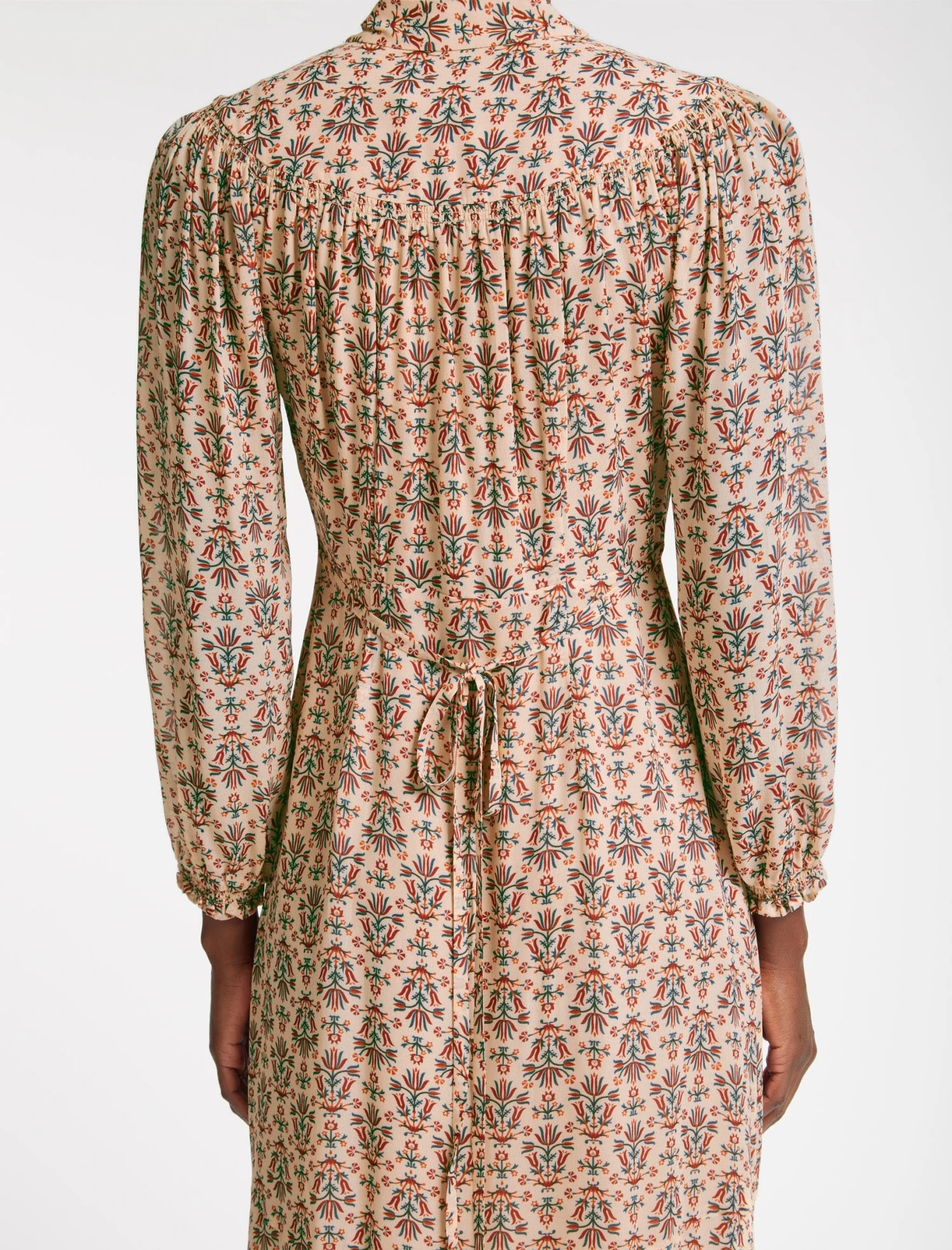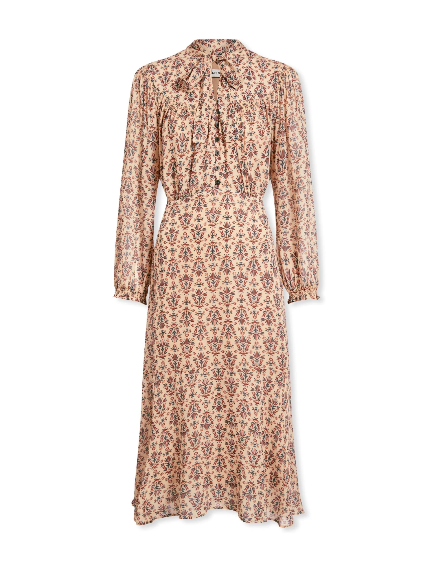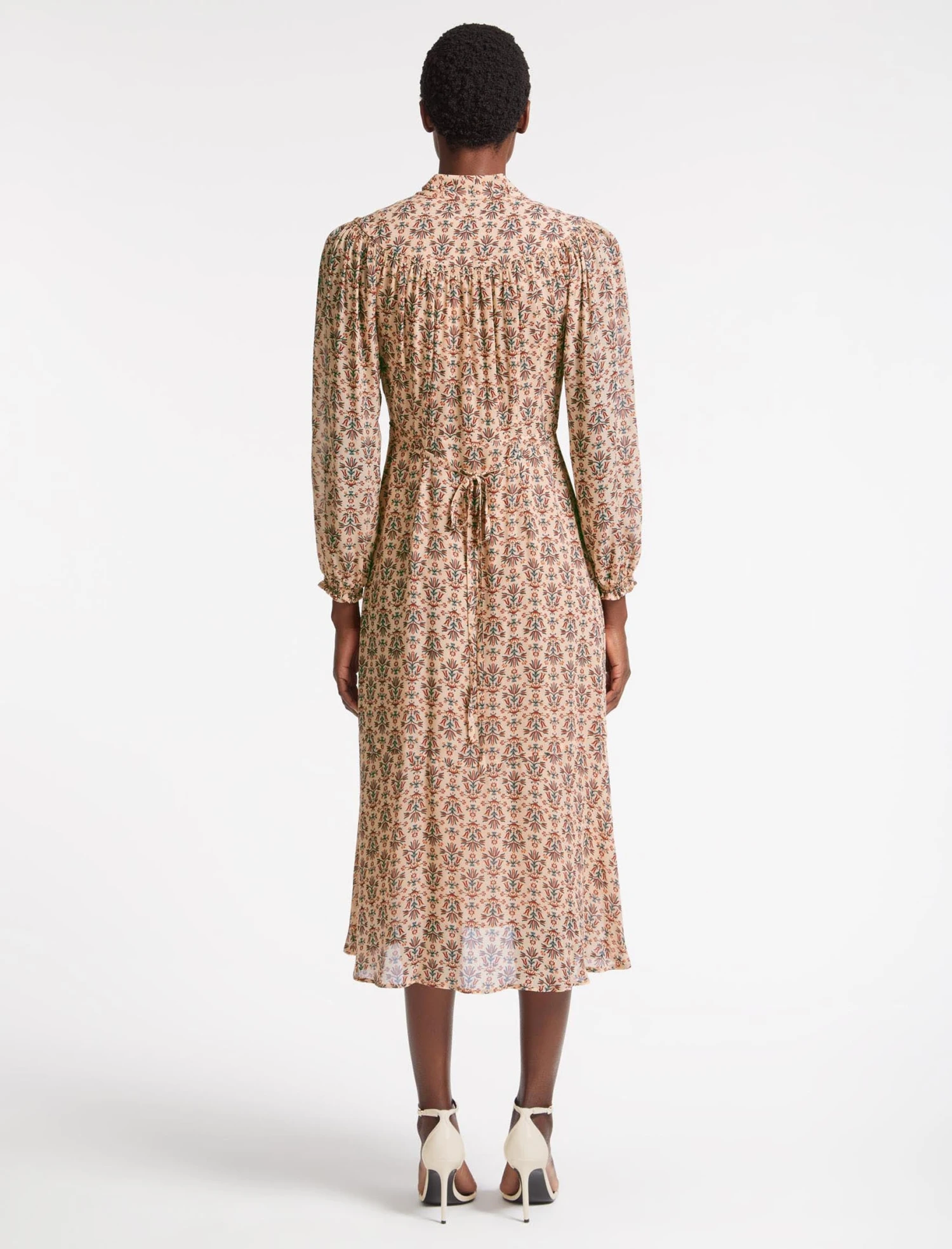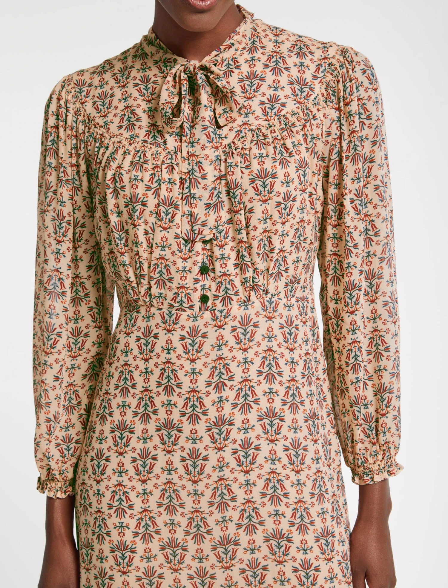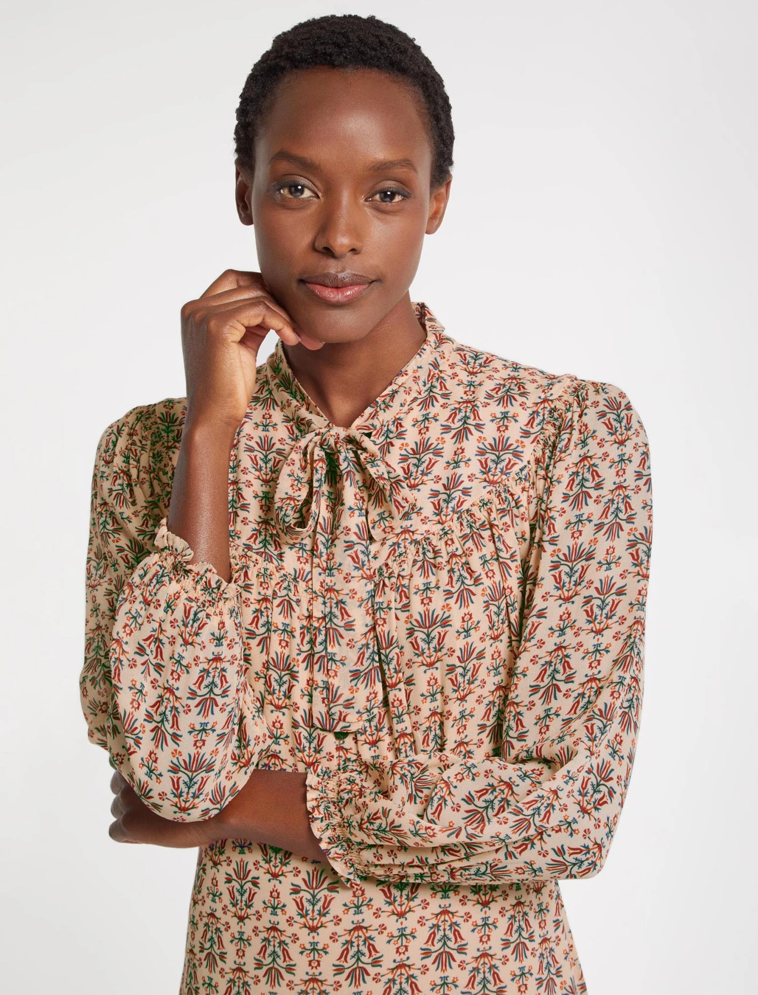Spring days call for our new Abigail dress. Cut from a delicate georgette blend in our folk floral print, the flattering silhouette (think gathered detailing and rouleaux waist ties) and gently shaped fit give it easy elegance. Channel its ladylike appeal with the pussy-bow tie and a classic knee-high boot or wear the necktie nonchalantly undone.