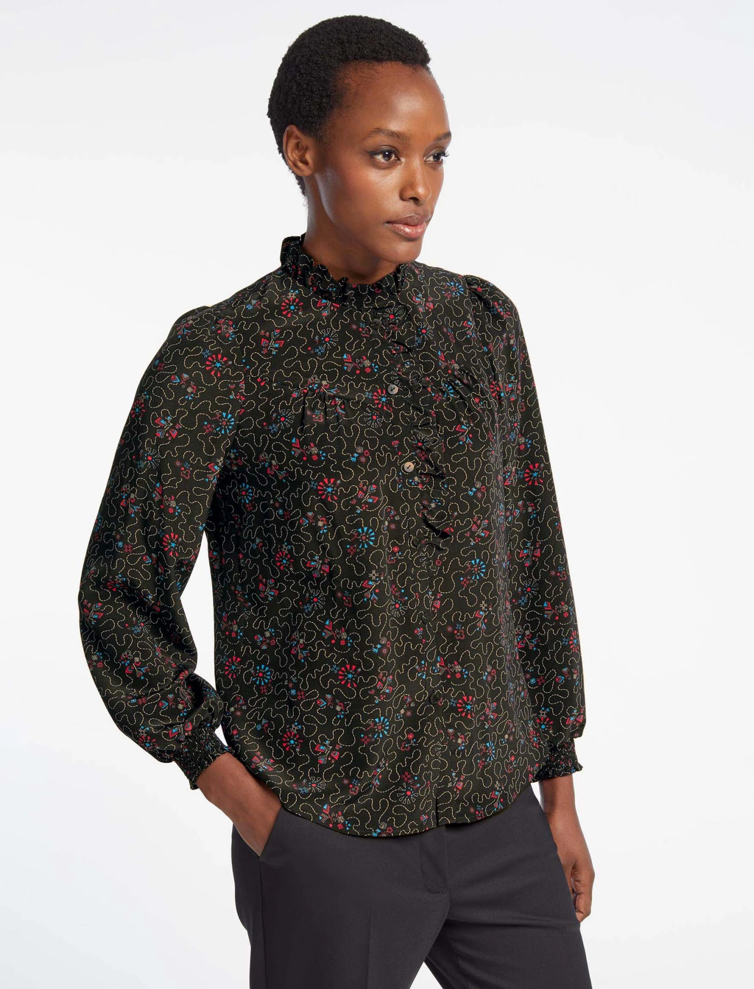 Designed in 100% silk and printed with our graphic wiggle design, Amelie has your spring wardrobe covered. With elegant details including the high frill collar, shoulder ruffles, eyelash cuff edging, you can afford to keep the rest of your styling simple – cue a smart jean or tailored trouser and a pointy heel.
