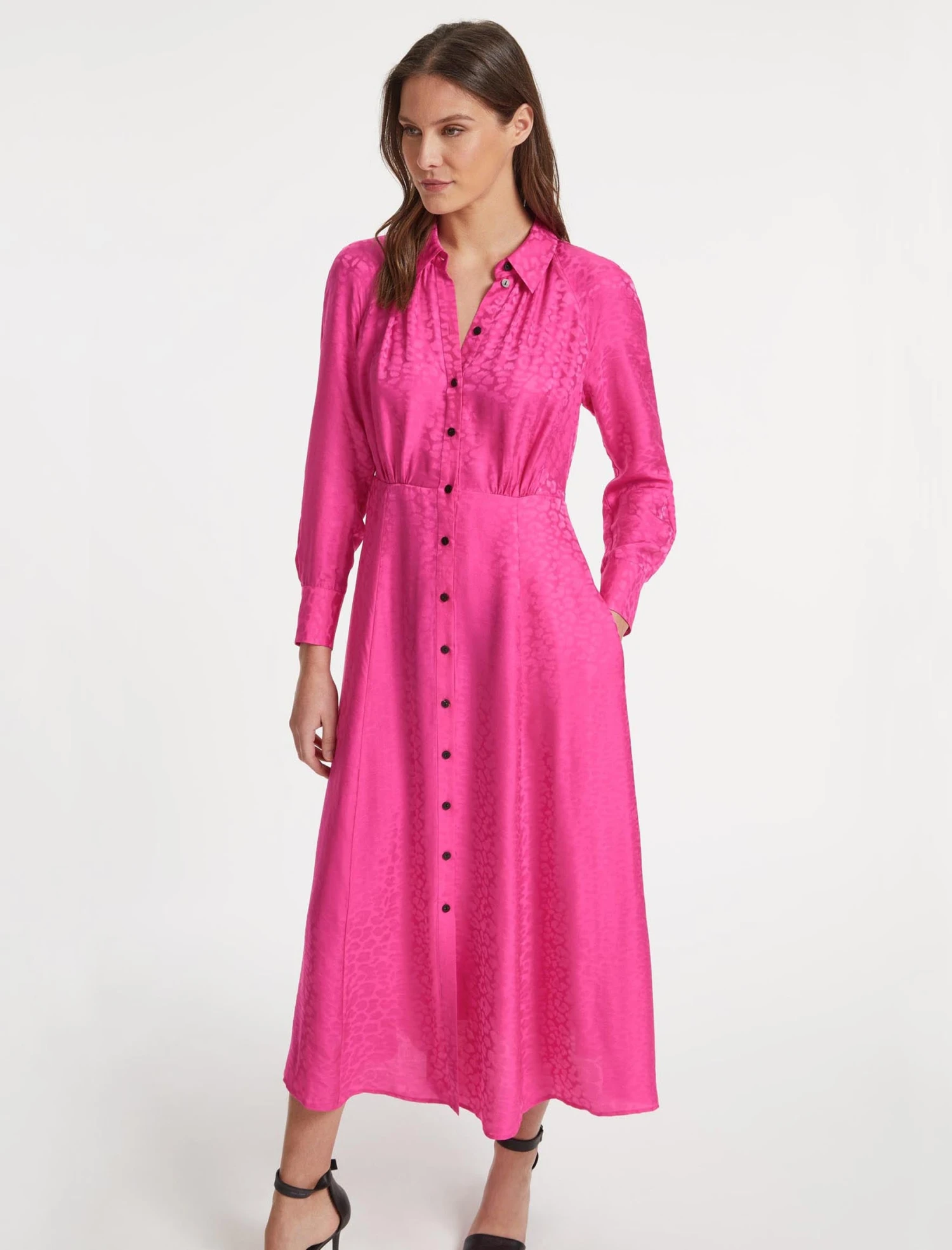 Nothing says summer quite like a hit of saturated colour. Our spin on a classic shirt dress, Astrid is cut from a printed silk jacquard blend in shimmery hot pink. Ideal for summer parties, the easy raglan sleeves, concealed modesty placket summarys, looser waist (nipped in at the back with a tie and rouleaux loops), side pockets and slits ensure it feels as good as it looks. For maximum impact, keep your accessories to a minimum.