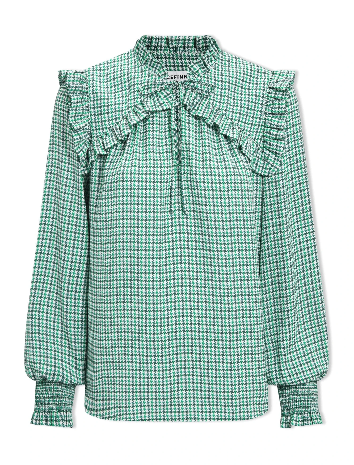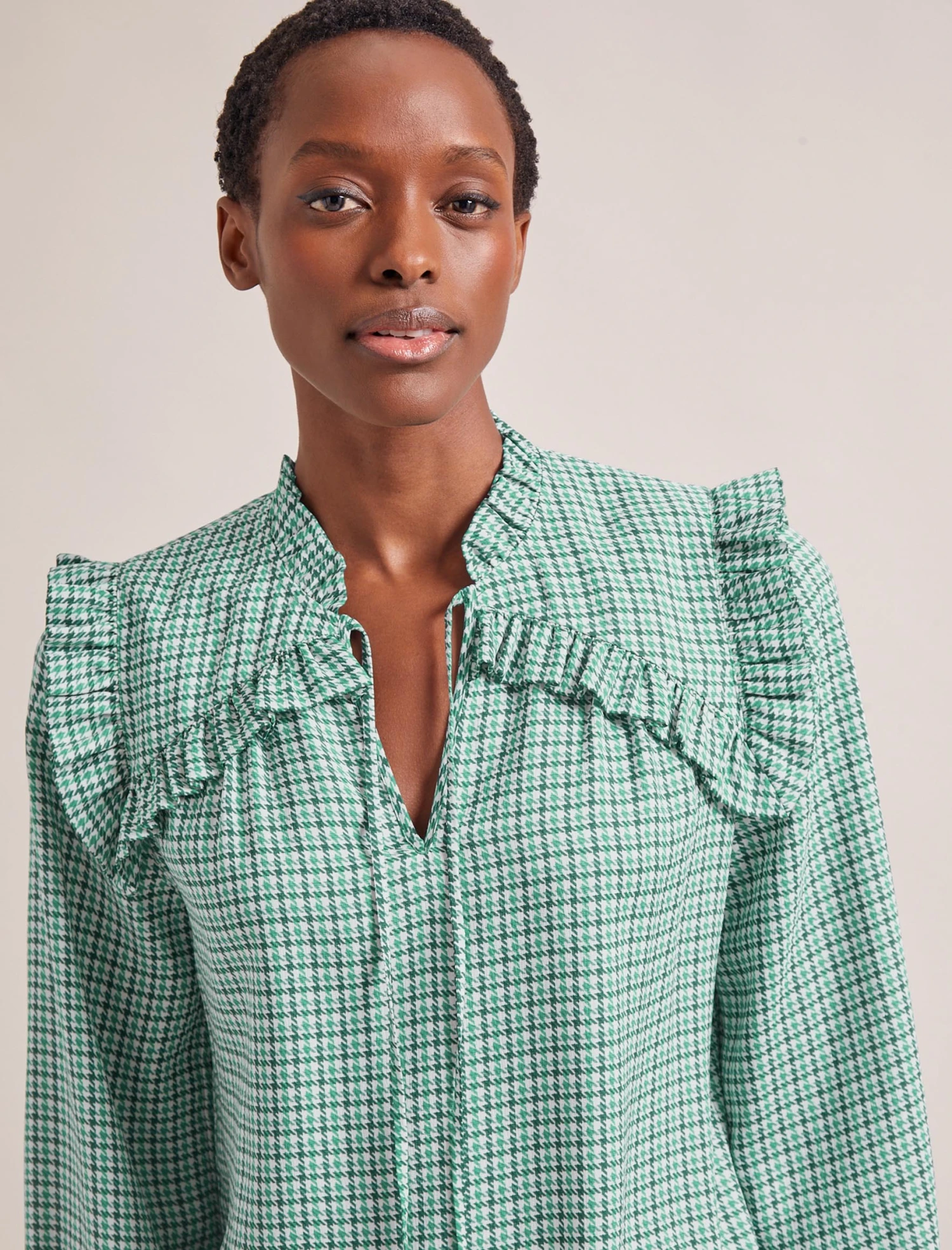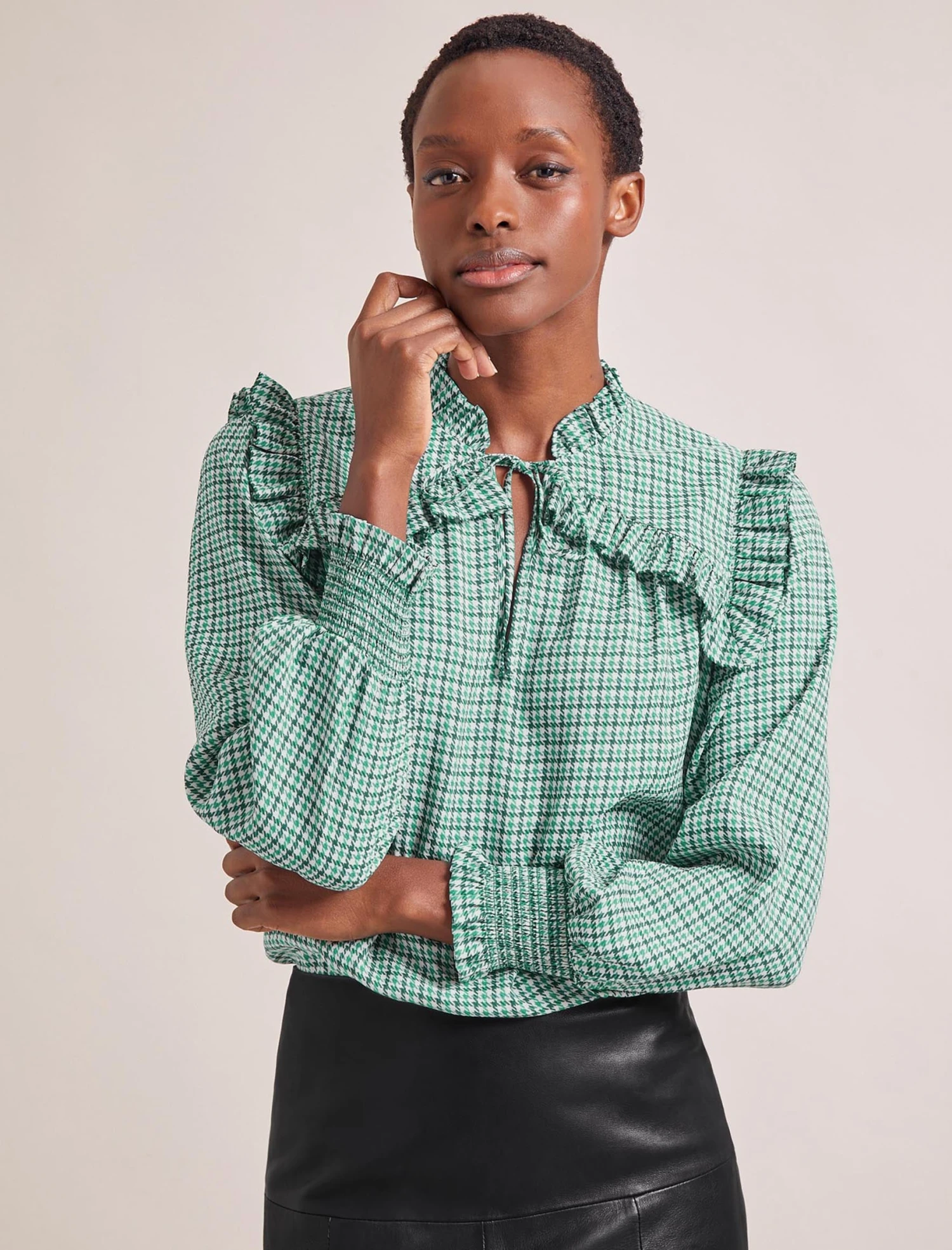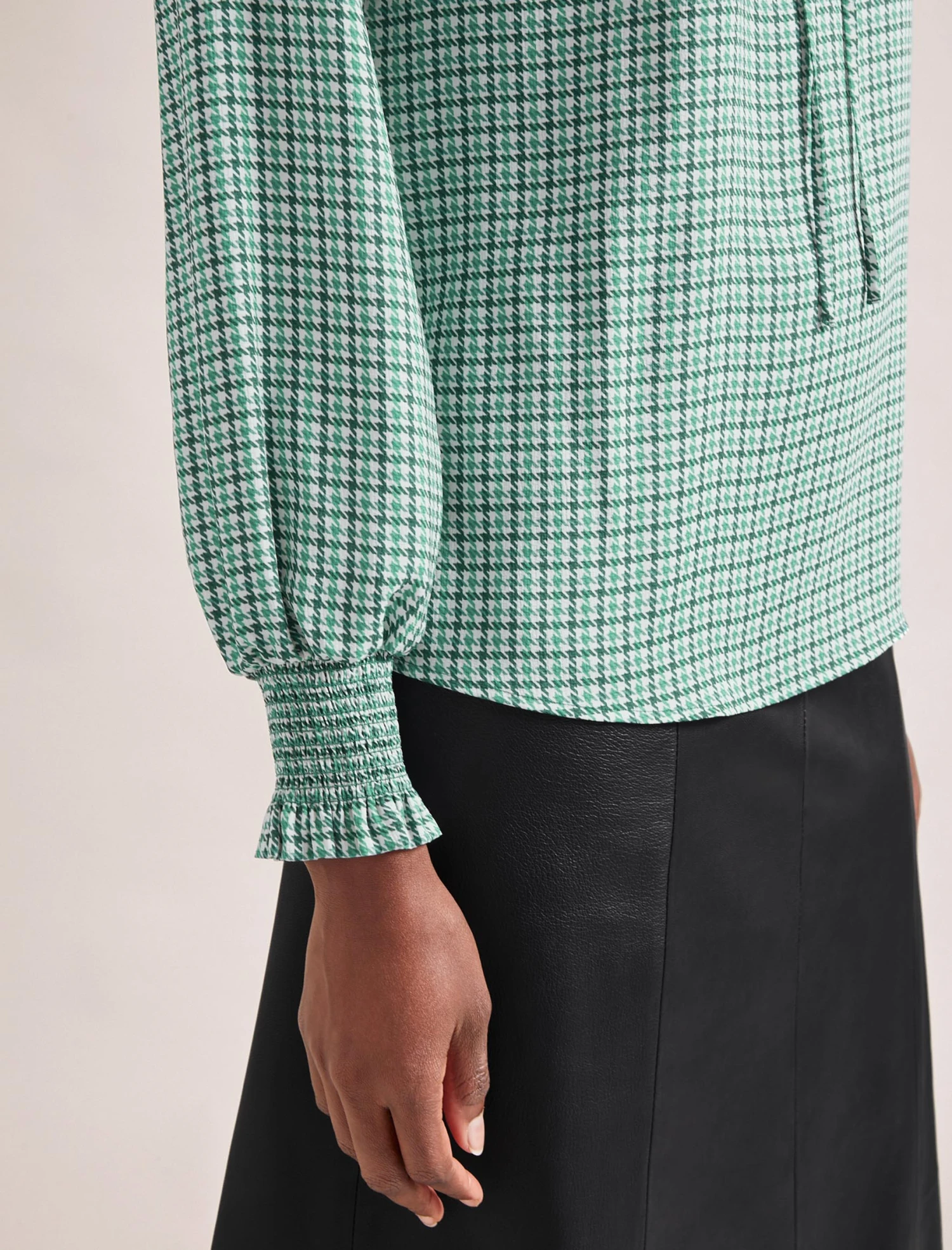 Taking its styling cues from our Loretta dress, Bay is designed from recycled hammered crepe and printed with our classic Houndstooth design. The bib collar gives an office-ready trouser like Terence or Margot a contemporary spin. It also doubles up as a great ‘impromptu-night-out’ top with a smart jean and heel.