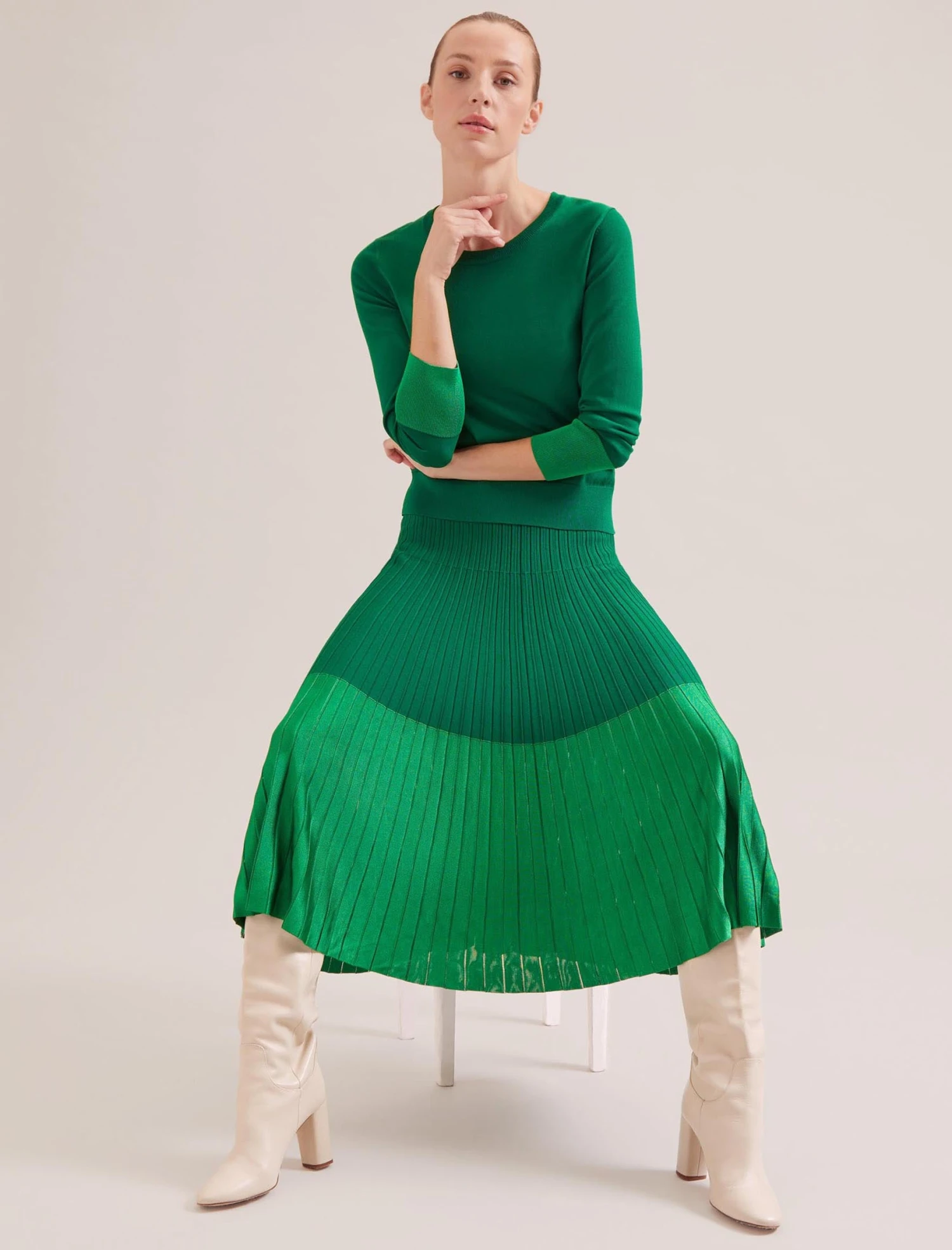 A swishy pleated skirt brings some feminine flair to spring-to-summer dressing. Cut from a rayon-blend knit, our Spring 2024 Colette skirt is lightweight, machine-washable and easy to maintain thanks to the permanent pleats. Wear with the matching Colette top for smarter work or lunch days or separately with a simple vest or T-shirt.