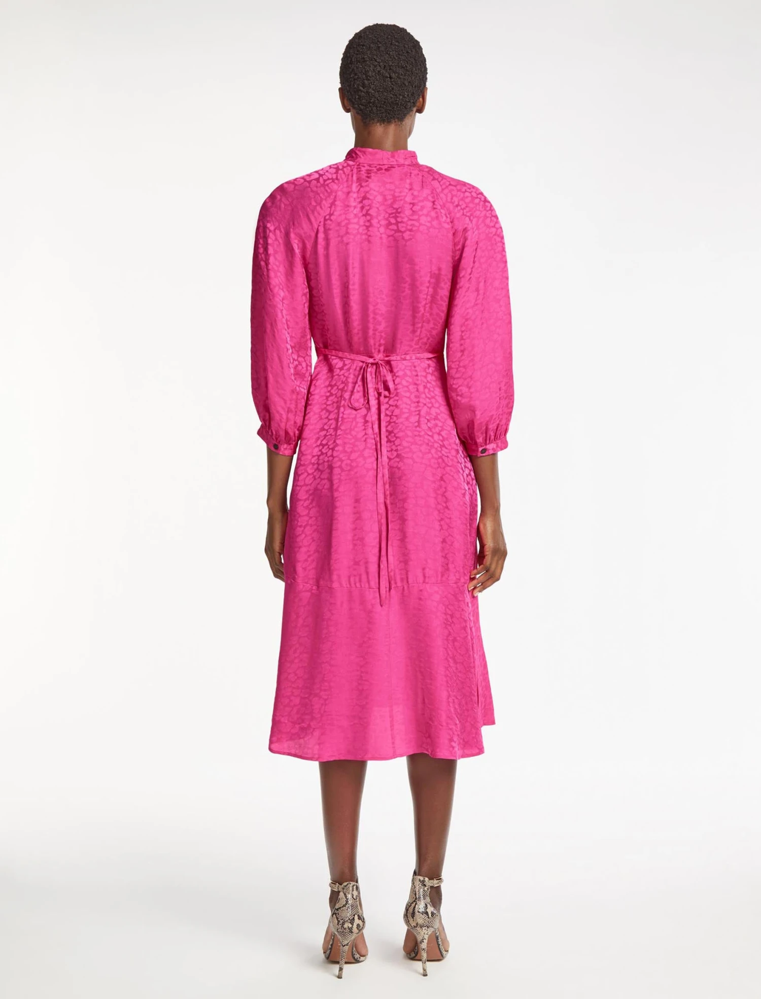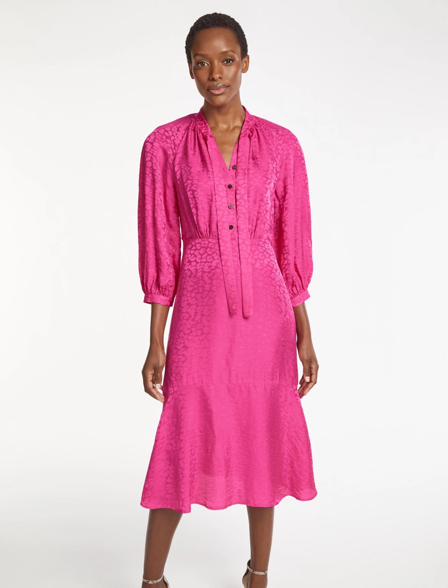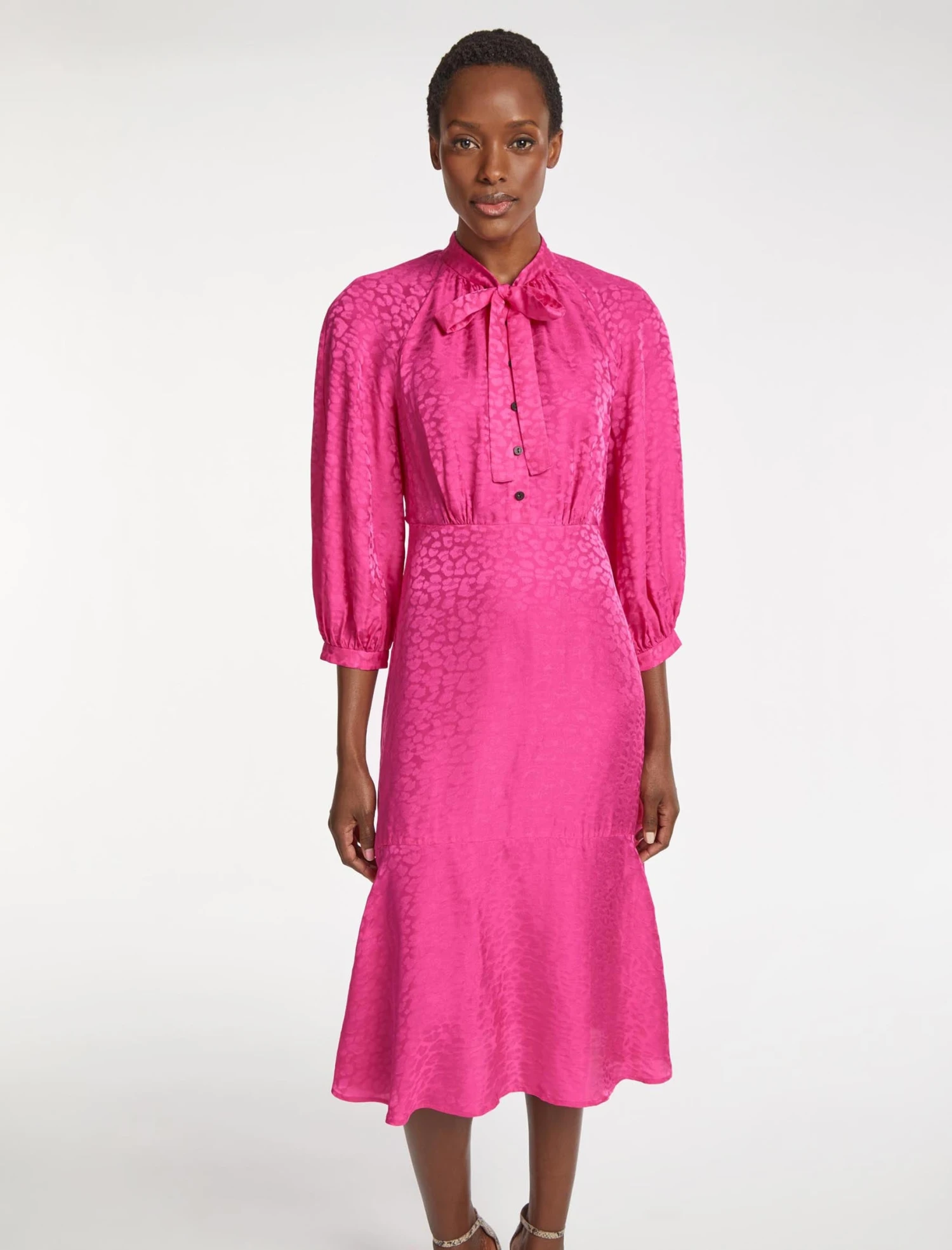 Our colour-pop silk-blend Daria dress is guaranteed to make a statement this season. The classic pussy-bow midi style has three-quarter-length raglan sleeves, a loose waist that can be nipped in with the slender belt and rouleaux loops, and side slits for ease of movement. Worn with a heel and a hint of lipstick, you’ll look (and feel) a million dollars.