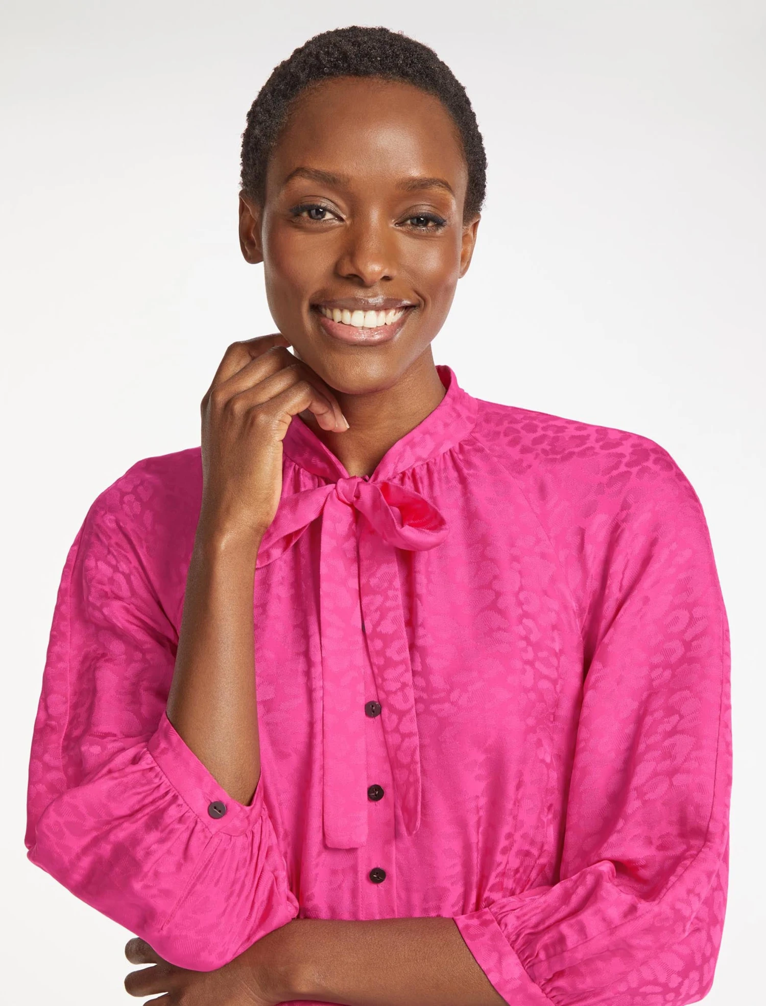- Neck pussy bow can be tied or worn loose
