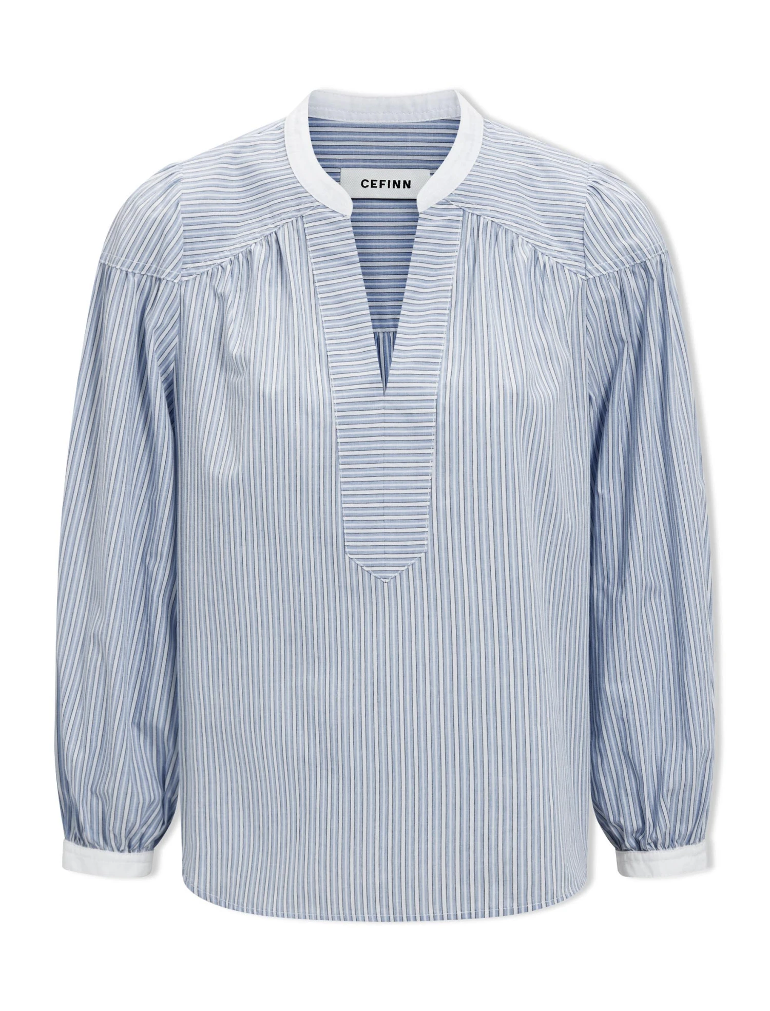 Cotton shirting comes into its own in spring. Lightweight, breathable and fresh, our new pin-striped Erica shirt features a flattering cutaway neckline, gathered detailing on the shoulder yoke and white trims on the collar and cuffs. Contrast the organic cotton with our glossy leather Tiana skirt or blue denim.