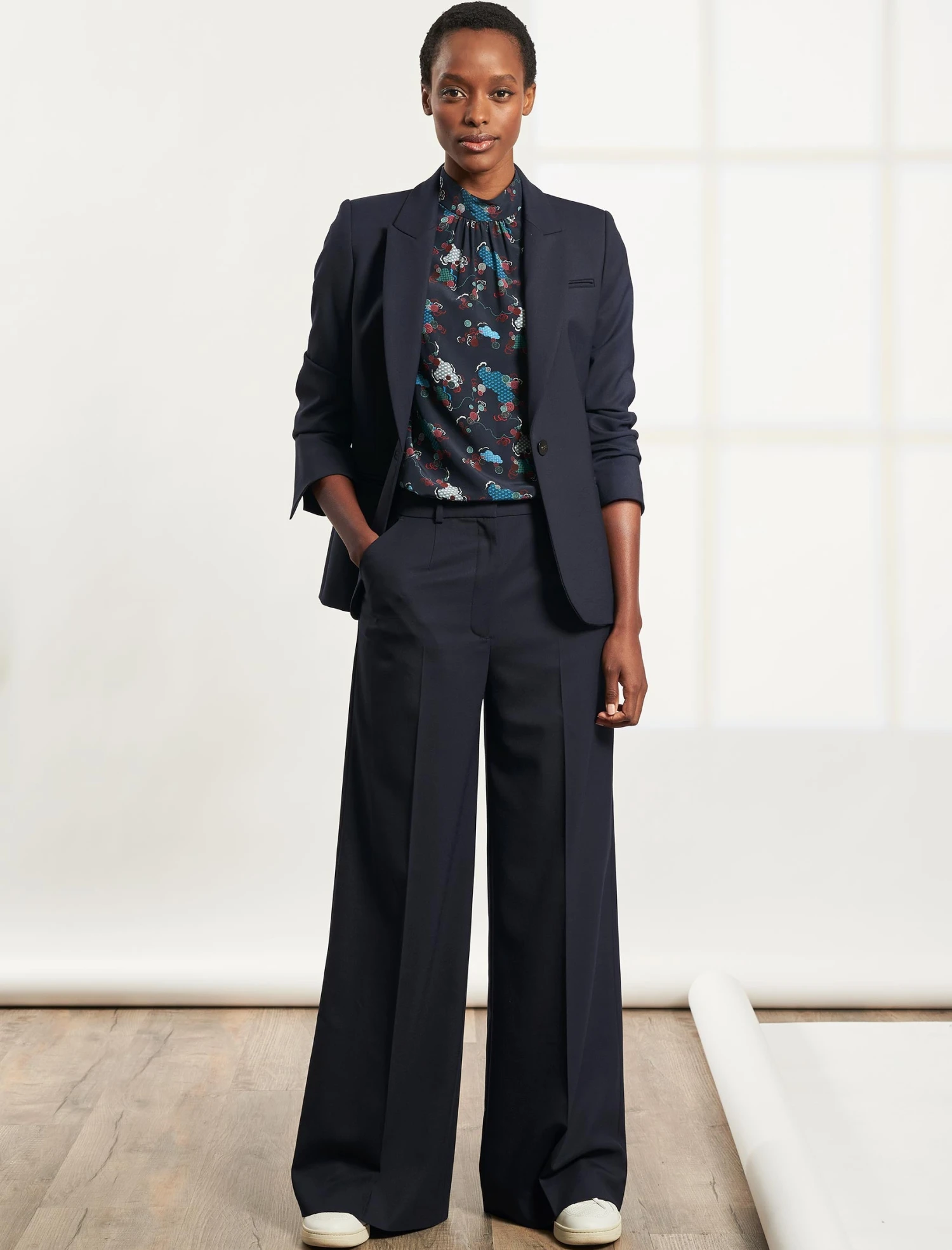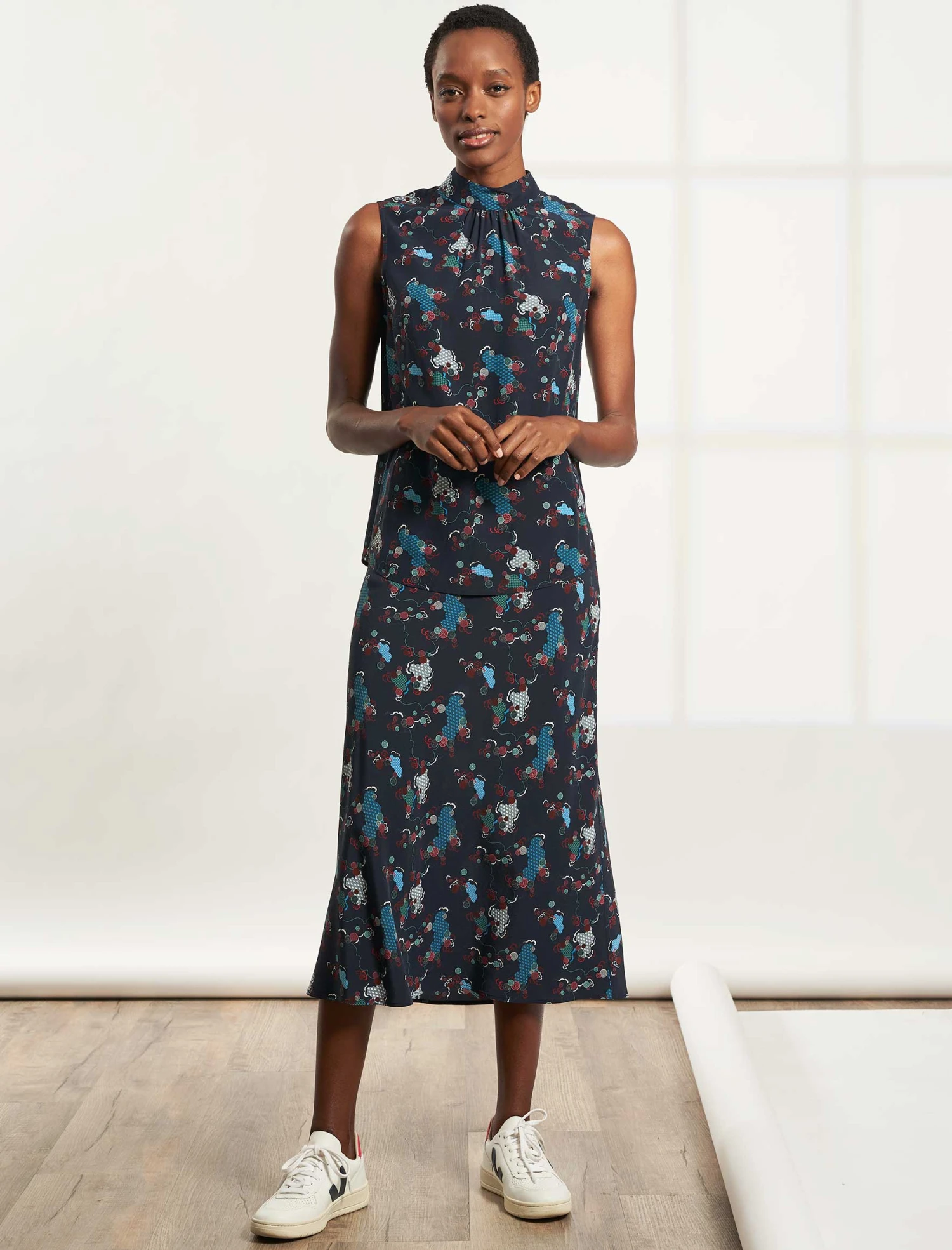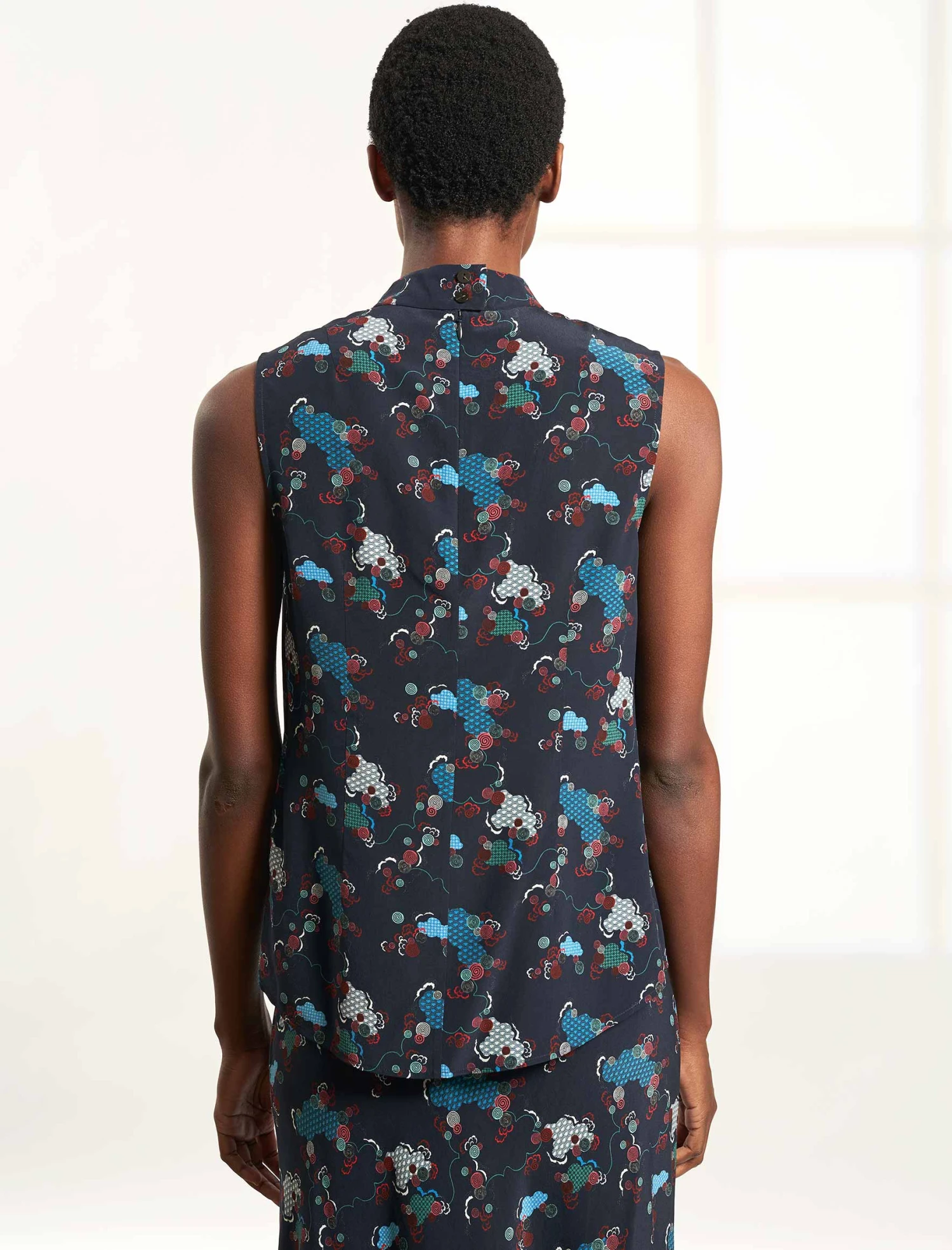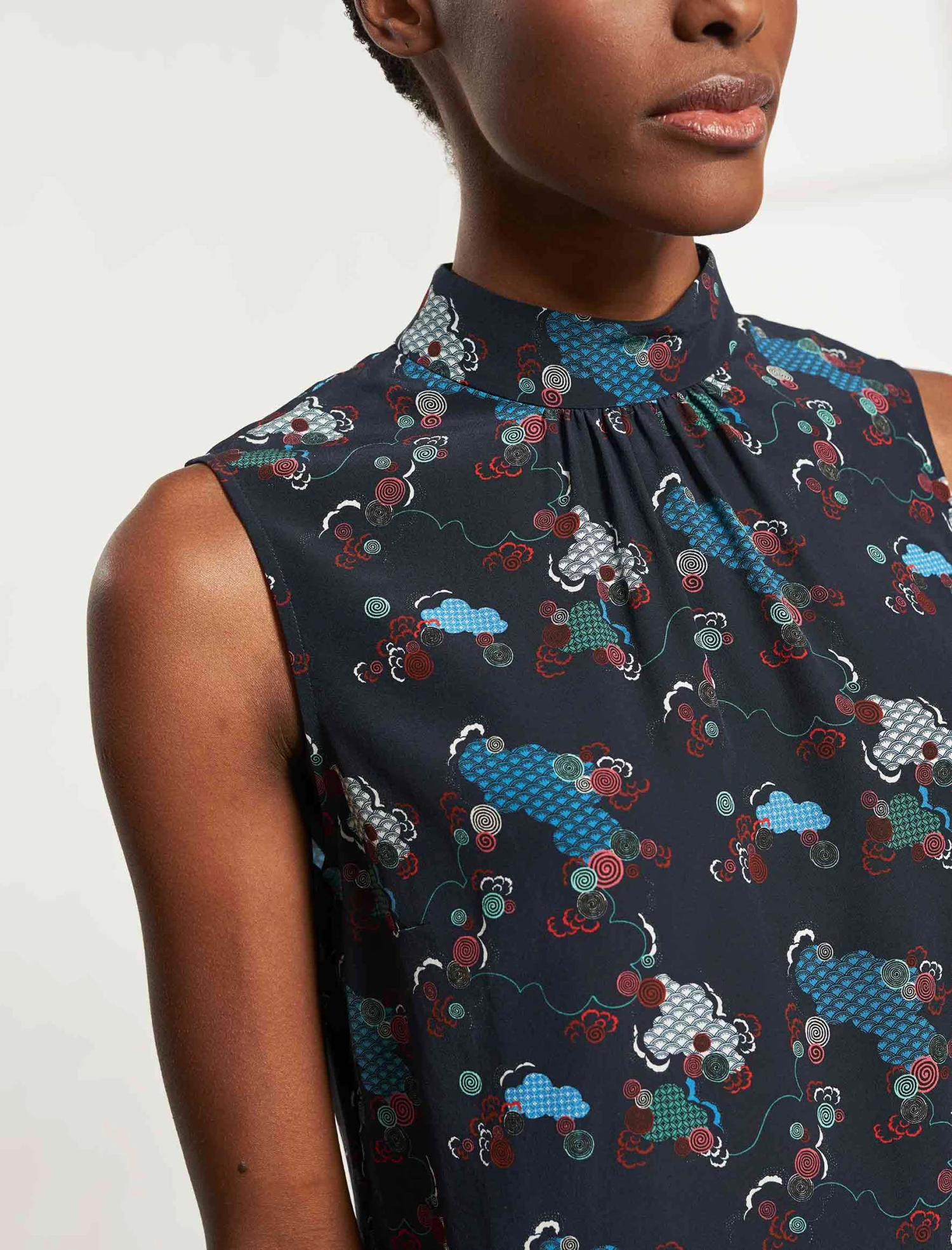 Perfect your sunshine style with this classic sleeveless blouse in 100% silk crepe de chine Spiral Clouds print, our latest in-house designed print. With its gathered, high-neck collar and curved hem with side slits, it has a cool Scandi-girl look that works as well at work as it does off duty. Wear it under a jacket, with jeans, tucked in or out – however the mood takes you. We cannot help but love it paired with clean white trainers.