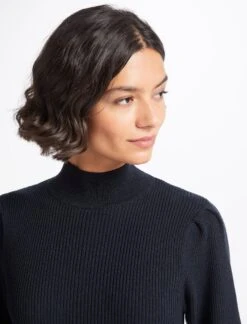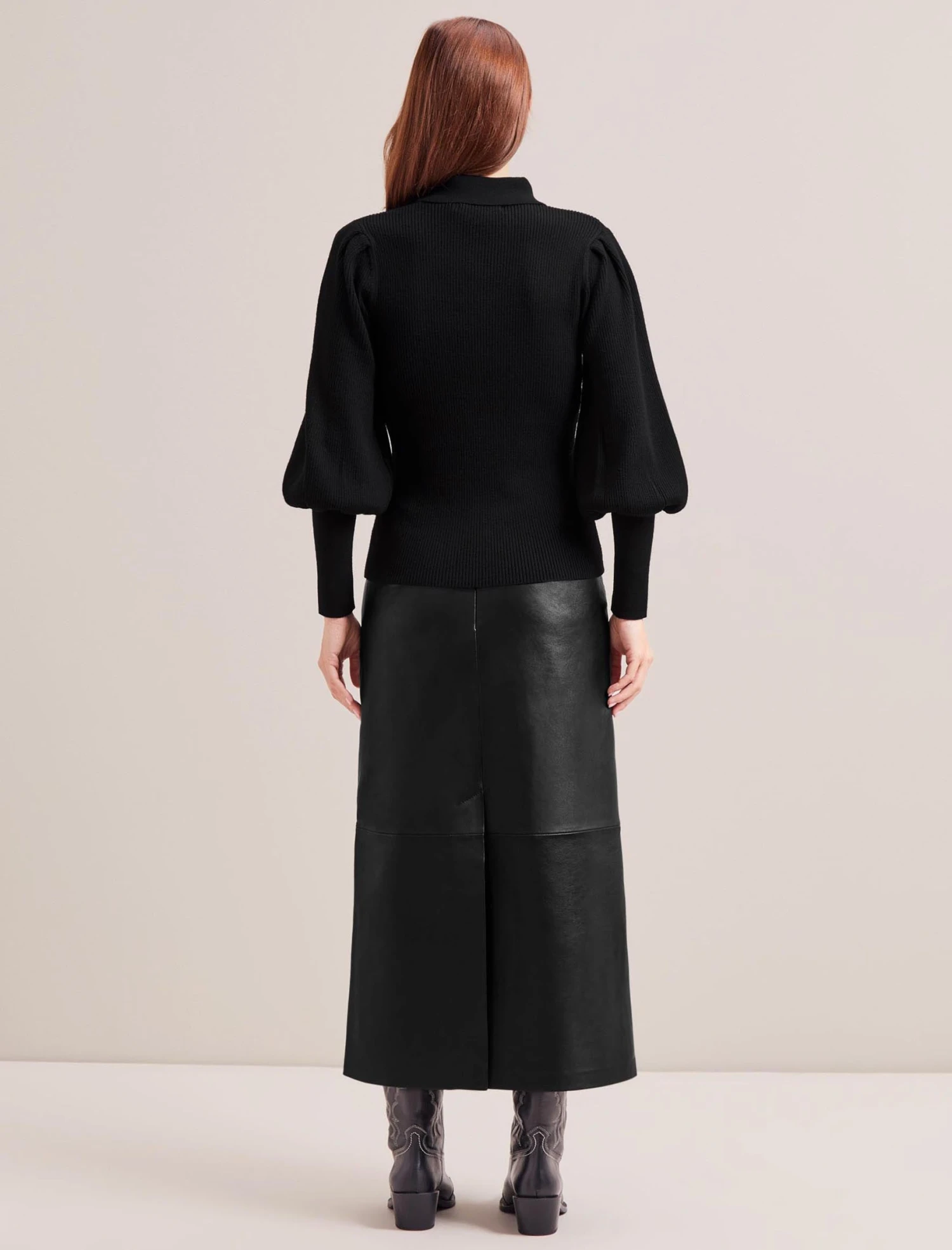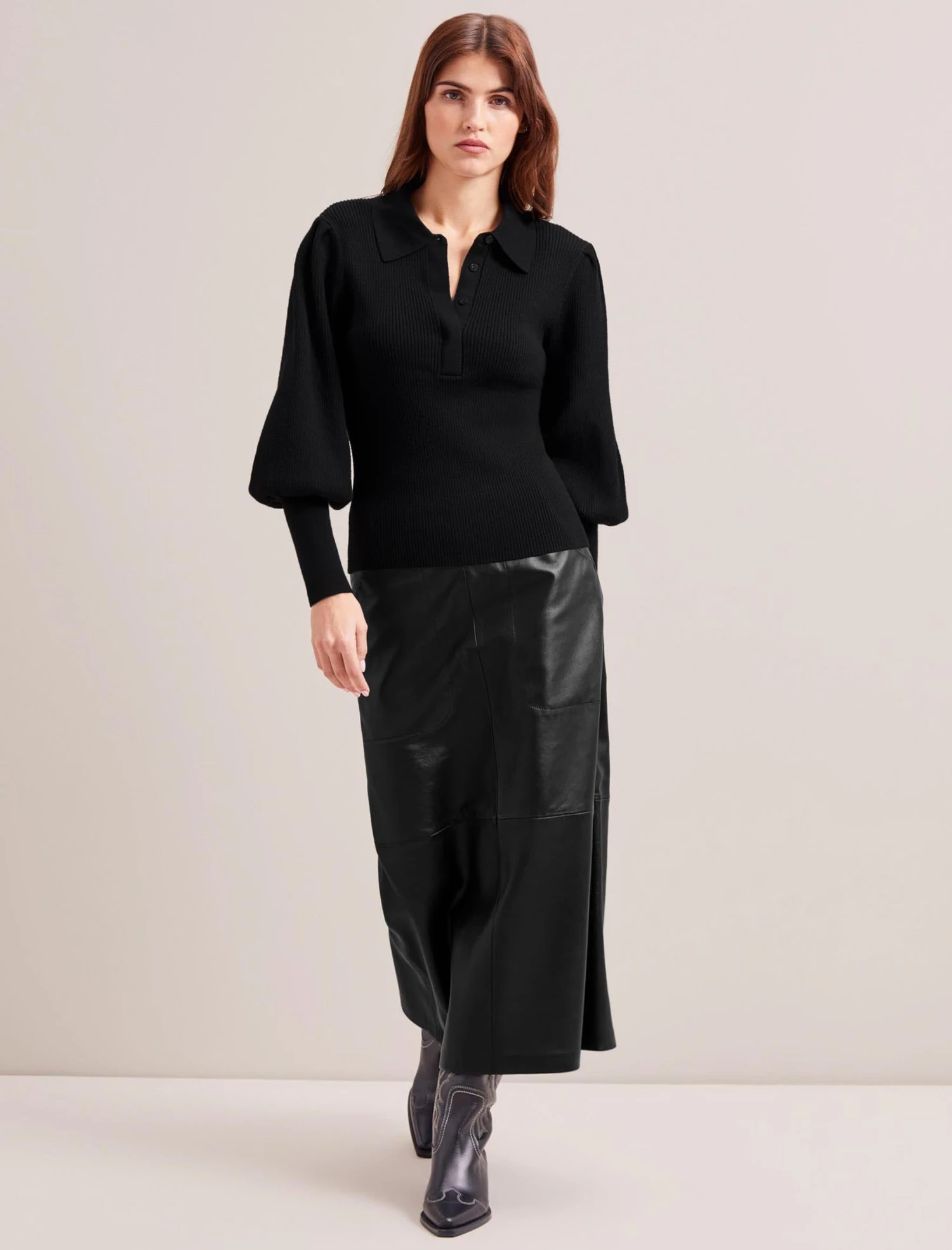 We’ve reworked our hero Eva top for FW23 with a polo-style neckline for effortless versatility. It’s designed in a soft merino-wool rib with added stretch to create a slimming silhouette, while the fitted cuff blouson sleeves add shape and volume. The perfect knit for when you want to feel pulled together, wear it with our leather Tiana skirt or any of our tailored trousers.