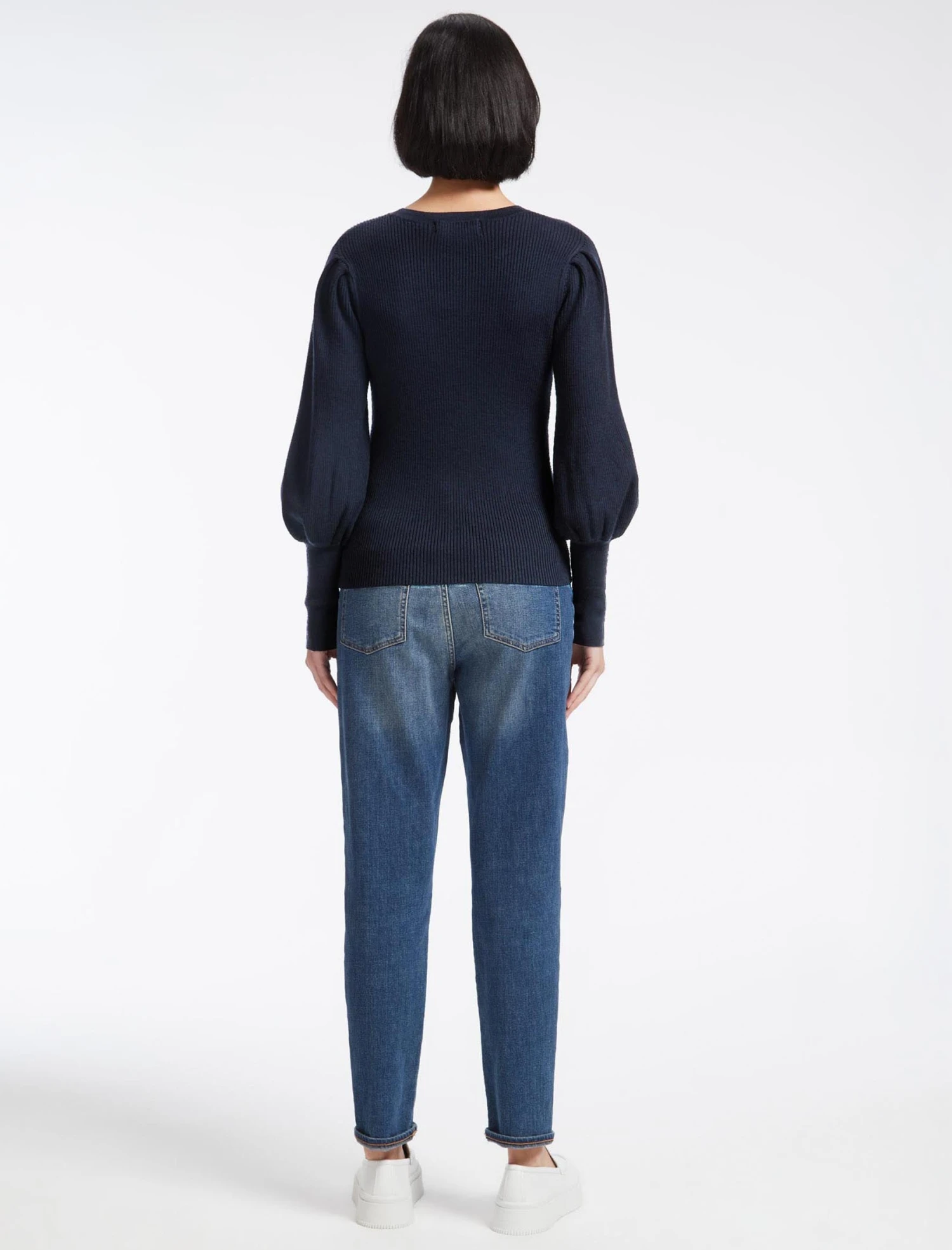 We’ve reworked our hero Eva style with a classic crew neckline for effortless versatility. The merino rib creates a slimming silhouette, while the fitted cuff blouson sleeves add feminine shape and volume. The ultimate pulled together knit, the Eva is the perfect alternative to a jacket and shirt. Wear with our leather Tiana skirt or any of our tailored trousers.