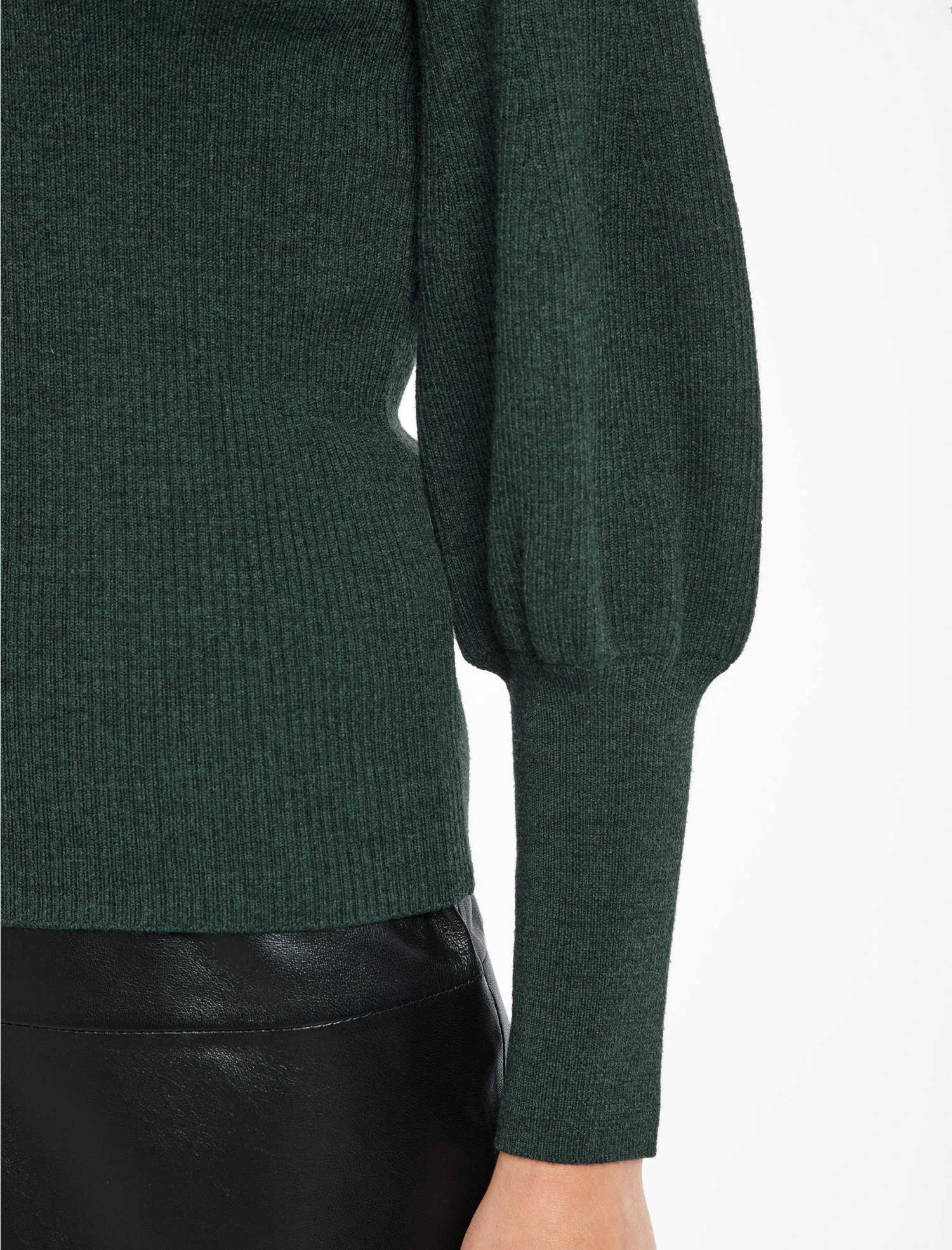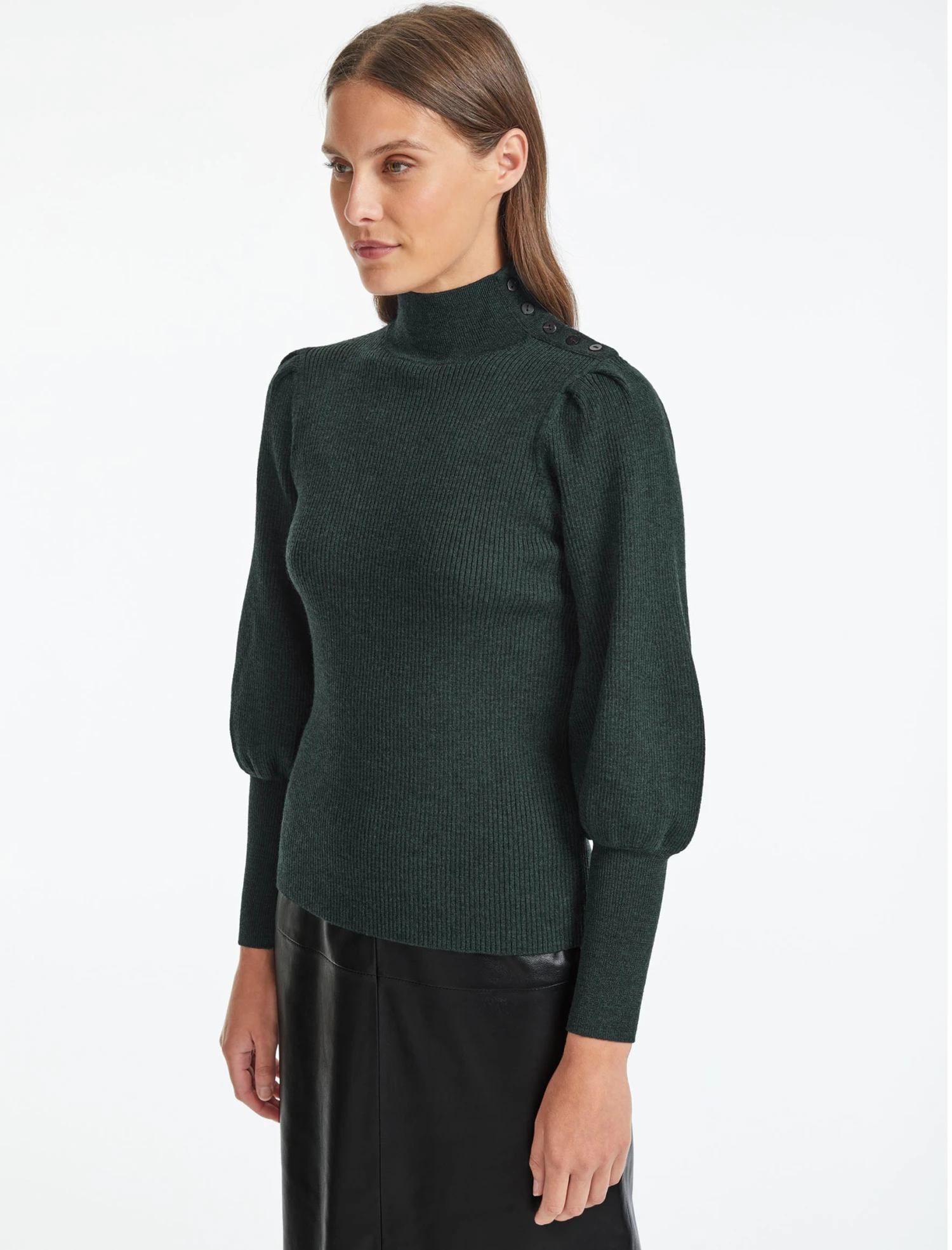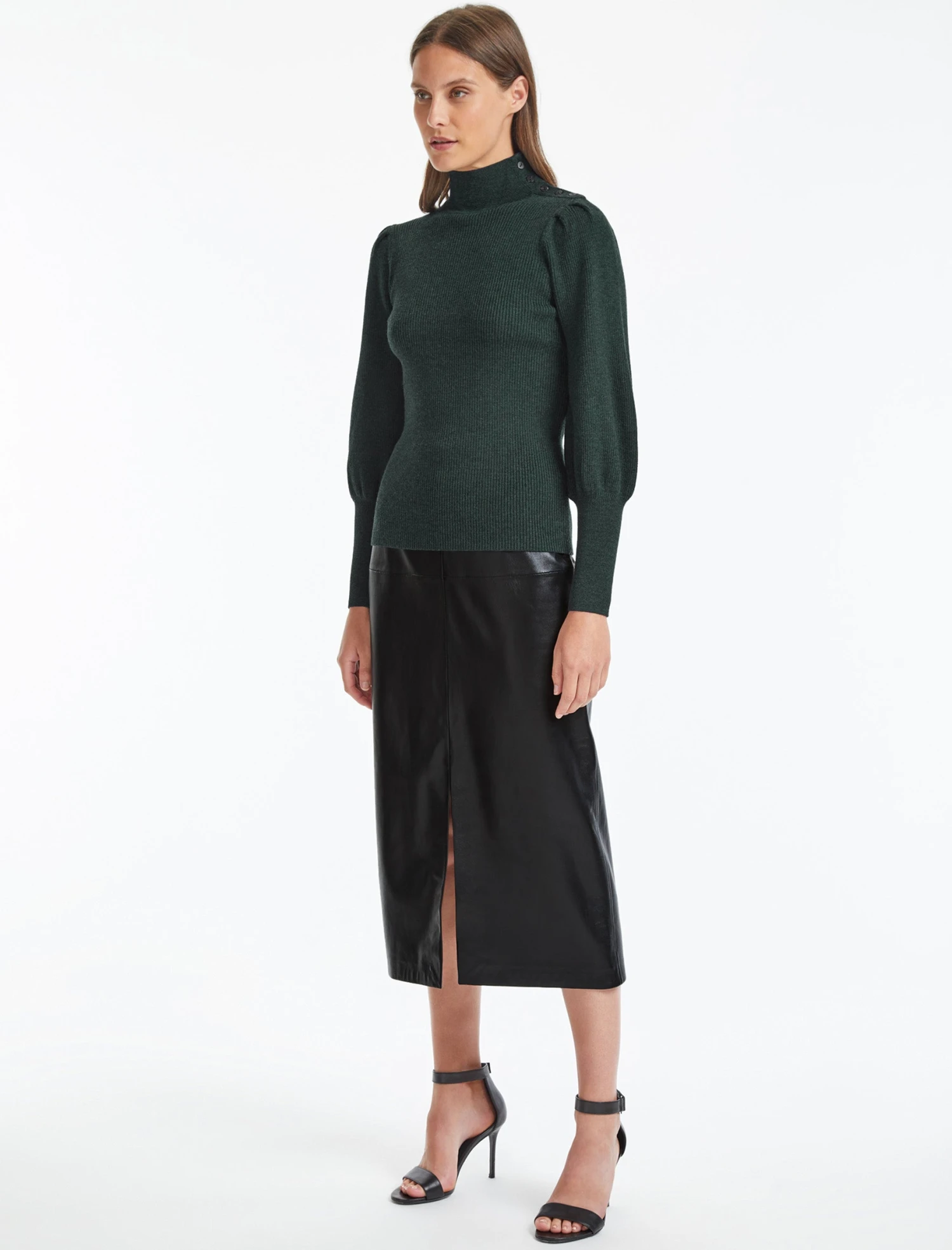 We’ve revisited our bestselling Eva jumper with a smart new summary shoulder placket and a chic funnel neck. Designed in our merino-wool blend rib to create a slimming silhouette,  the fitted cuff blouson sleeves add feminine shape and volume. An elevated take on a simple sweater, wear with our leather Zola skirt or our Tennyson trouser and a heeled boot.