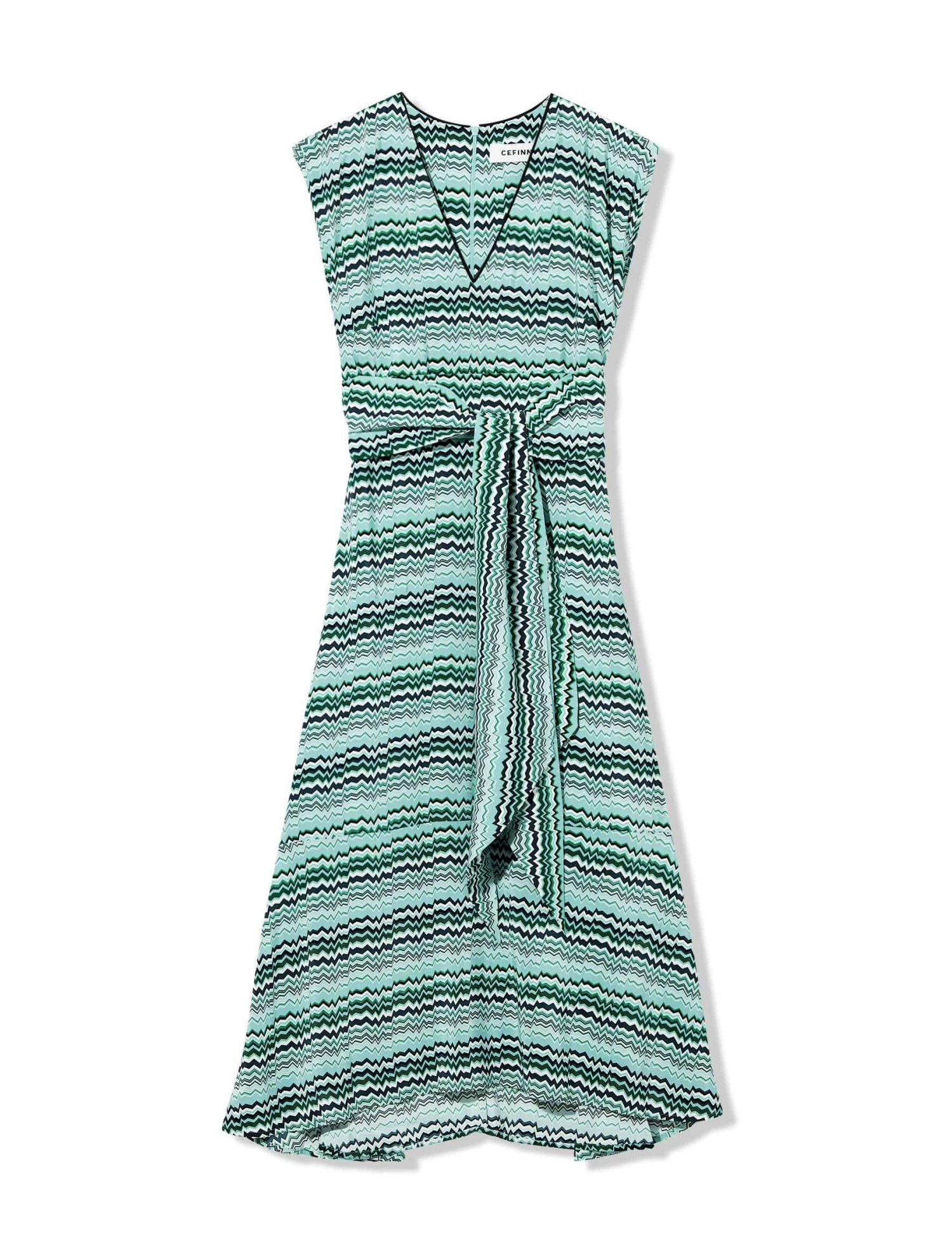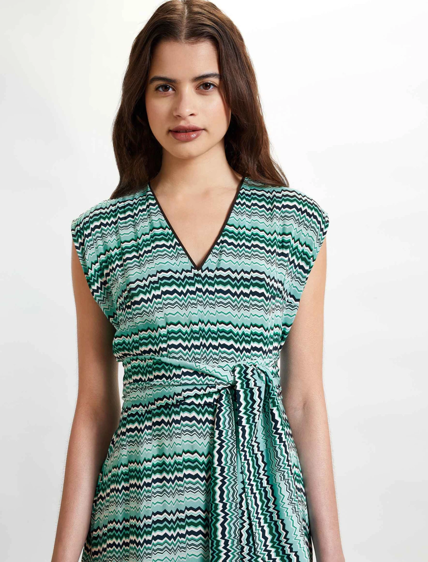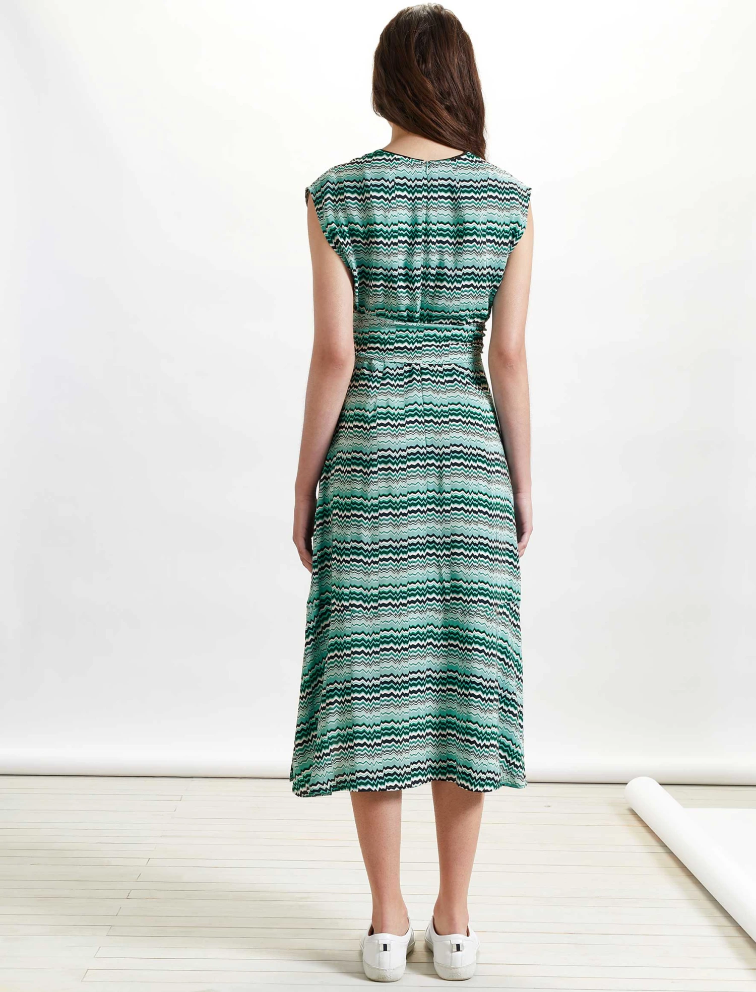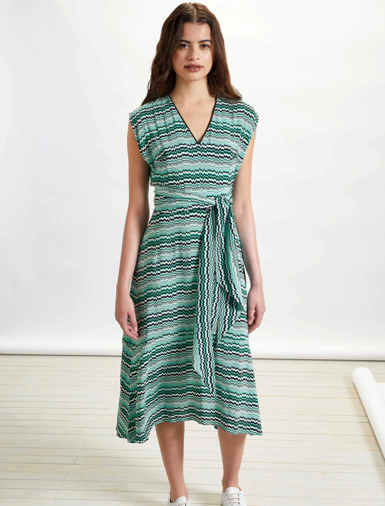 This V-neck midi in new colourways of our graphic chevron print in silky viscose is a must-have, summer dress for casual work days, holidays or evening gatherings with friends. The flattering silhouette with its sash that ties you in at the waist is easy to dress up or down depending on your mood. We love it with trainers or flat sandals for an easy, hot-weather look. And on chilly summer evenings, throw our new merino wool Sidney scarf over your shoulders.