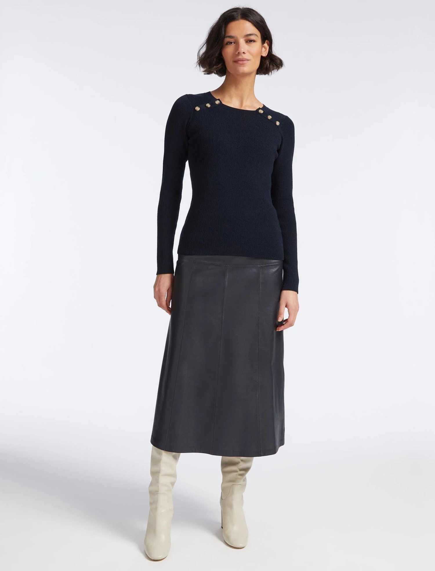 Spring may not instantly say knitwear, but a few mid-to-lightweight jumpers are key to a trans-seasonal wardrobe. Enter, then, Freida. A rework of a classic Breton style, it is cut from a cotton-and-merino-wool blend that feels fresh and light on the skin. The fixed summary detailing adds extra interest to the crew neck style. Wear under suiting or jackets for a contemporary spin.