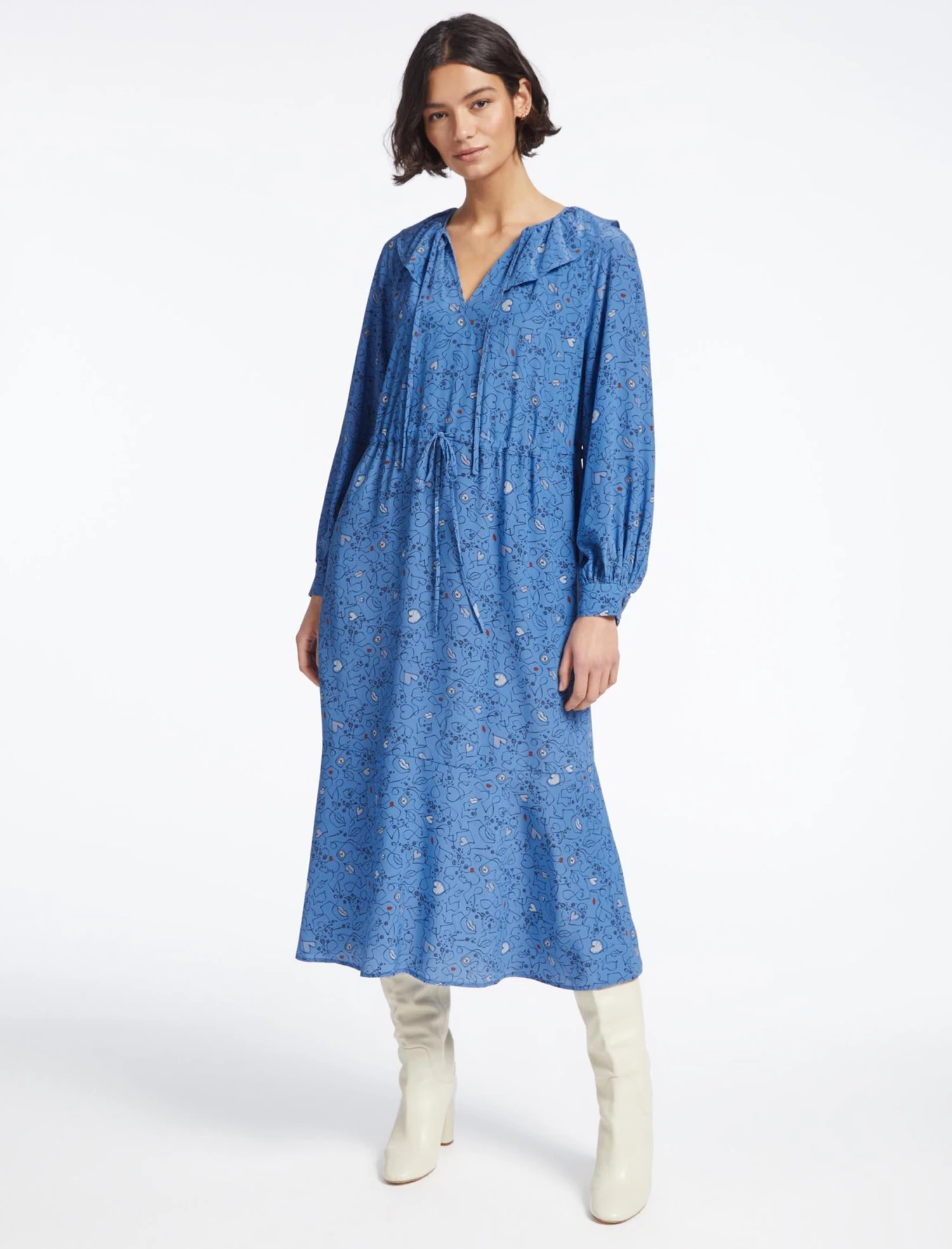 A key trend for 2023, low-key luxury is a Cefinn hallmark. Take our silk Georgia midi dress. Versatile, timeless and with year-round appeal, the easy waist and frilled collar tie can be worn loose or tied, depending on your shape, mood or occasion. Add the long, cuffed sleeves, delicate print and midi length, and you have the perfect all-season dress.