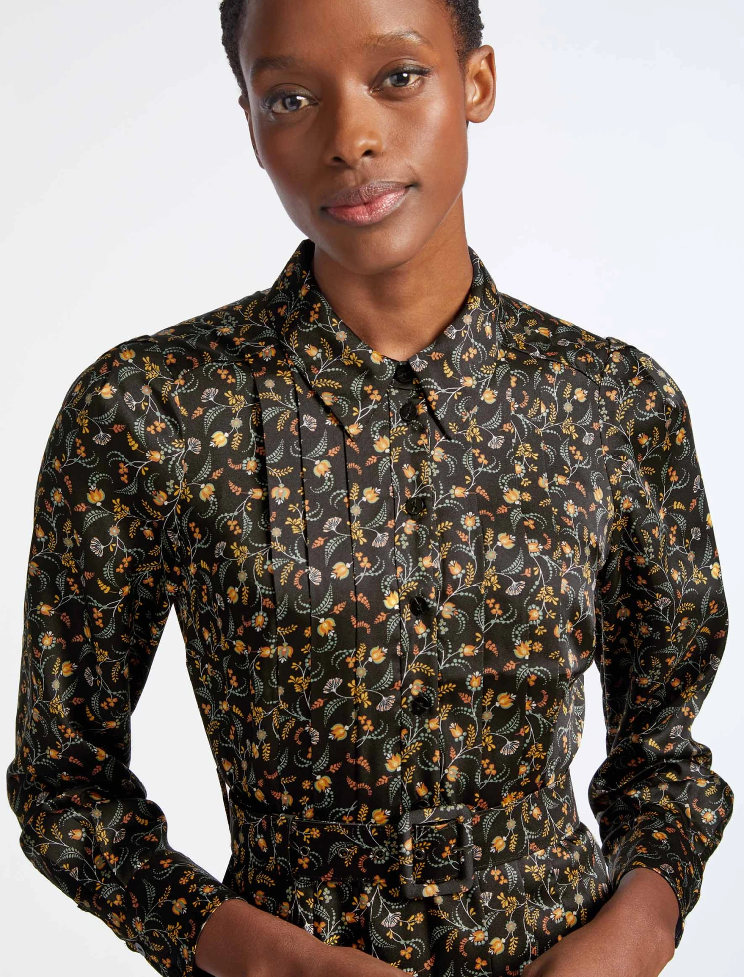 Designed with slimming, crease-resistant permanent pleats that fall from the bodice to the skirt, our Georgie dress has been made in our recycled twill, which has a beautiful matt sheen. The light, drapey fabric, trailing floral print and fixed buckle belt make it an elevated take on a classic shirt dress. Add a smart black jacket and a slender heel, and statement dressing has never looked so chic.