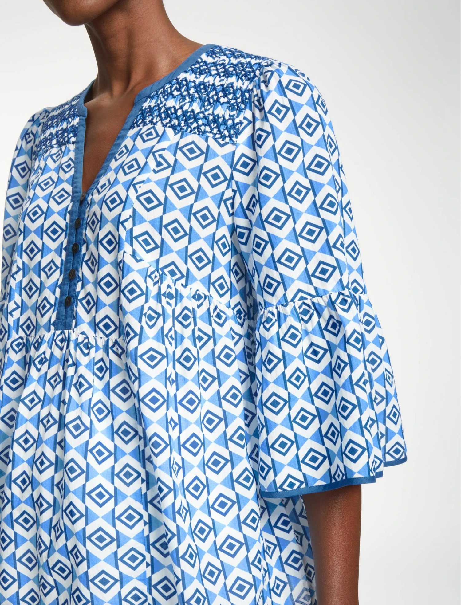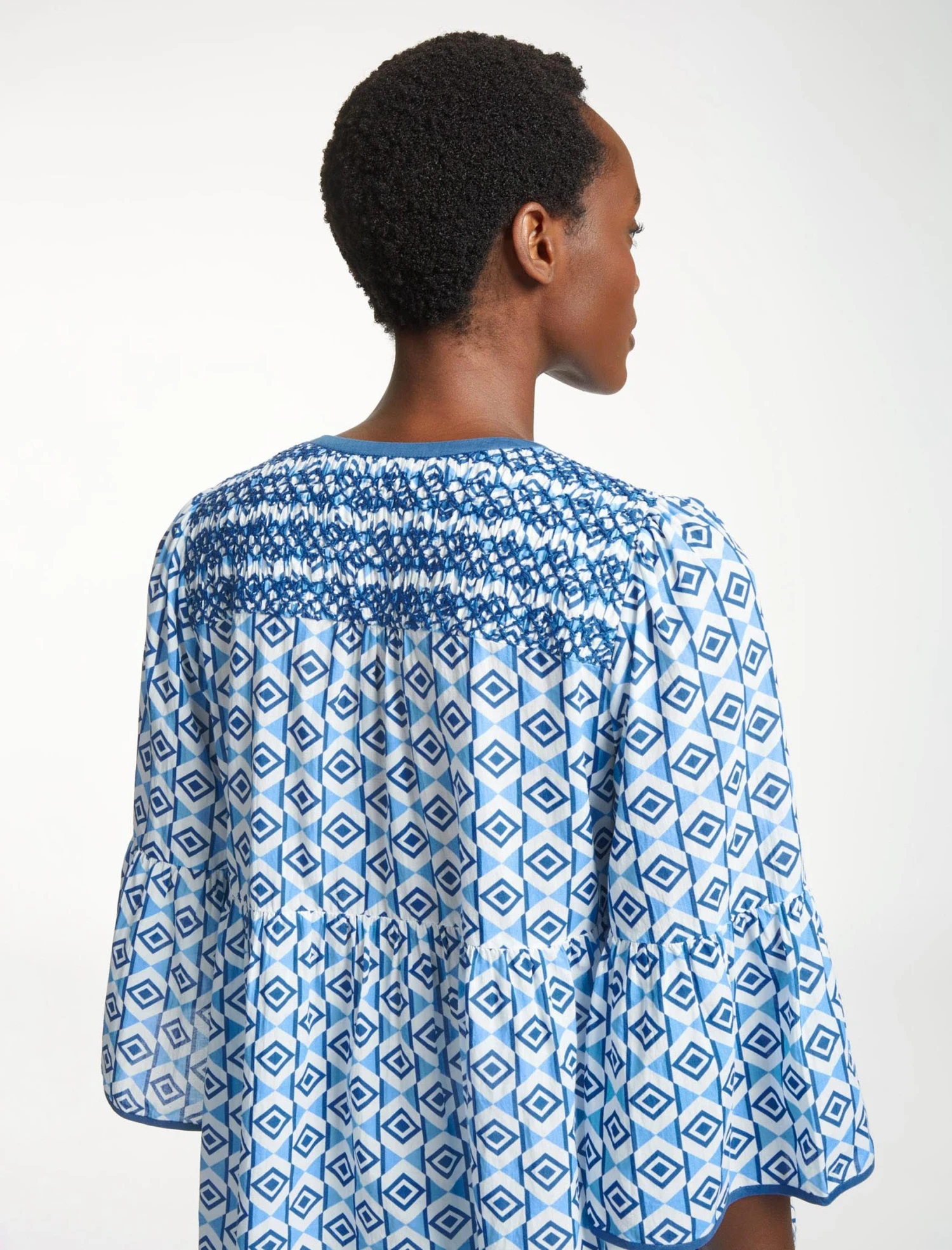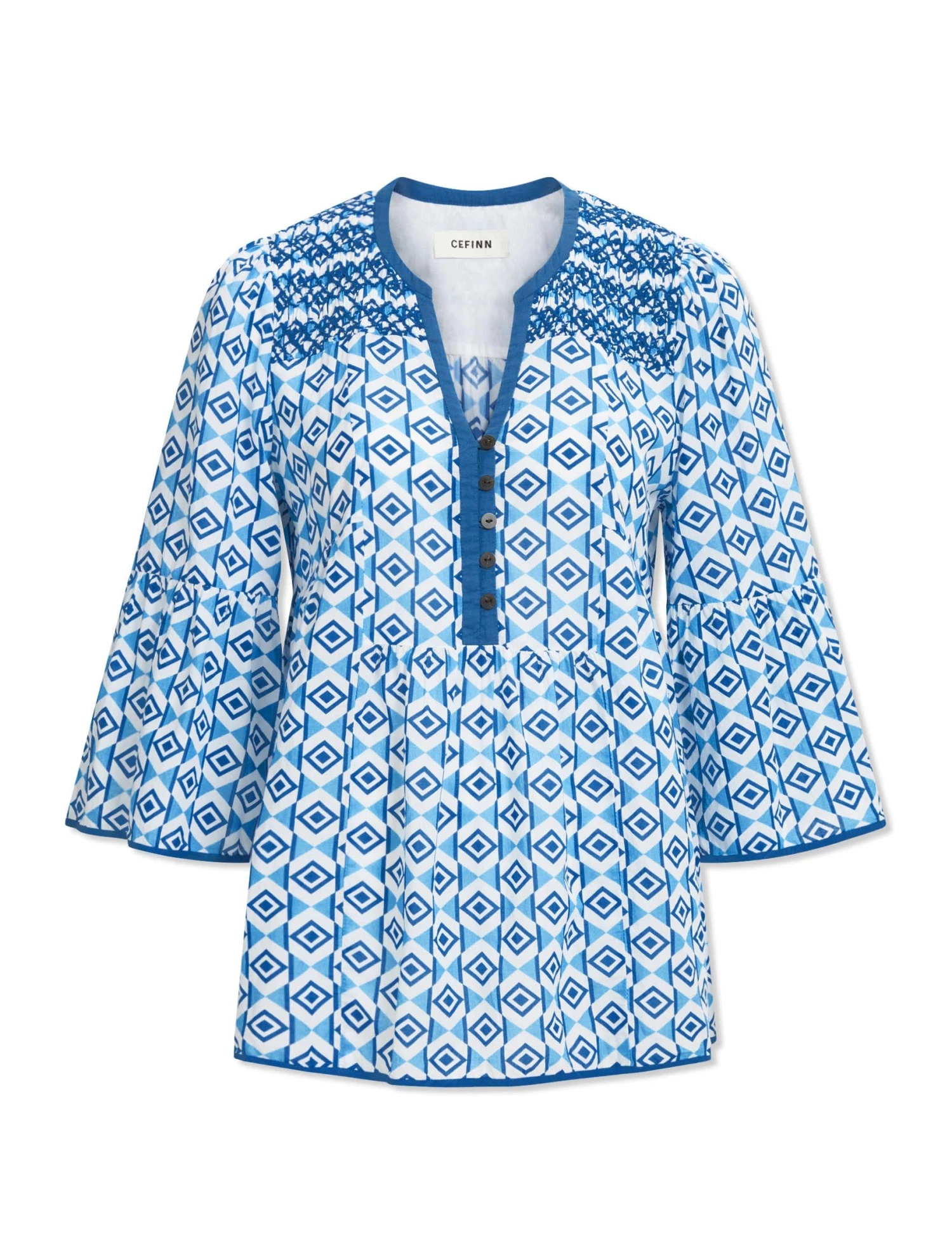 A relaxed top for easy summer days, our Hester blouse takes its design cues from peasant tops. Made from a cool cotton blend with our graphic geo print and hand-embroidered smocking detail, it has effortless elegance written all over it. A cool option for hot days with white denim, cut-offs or over a bikini.