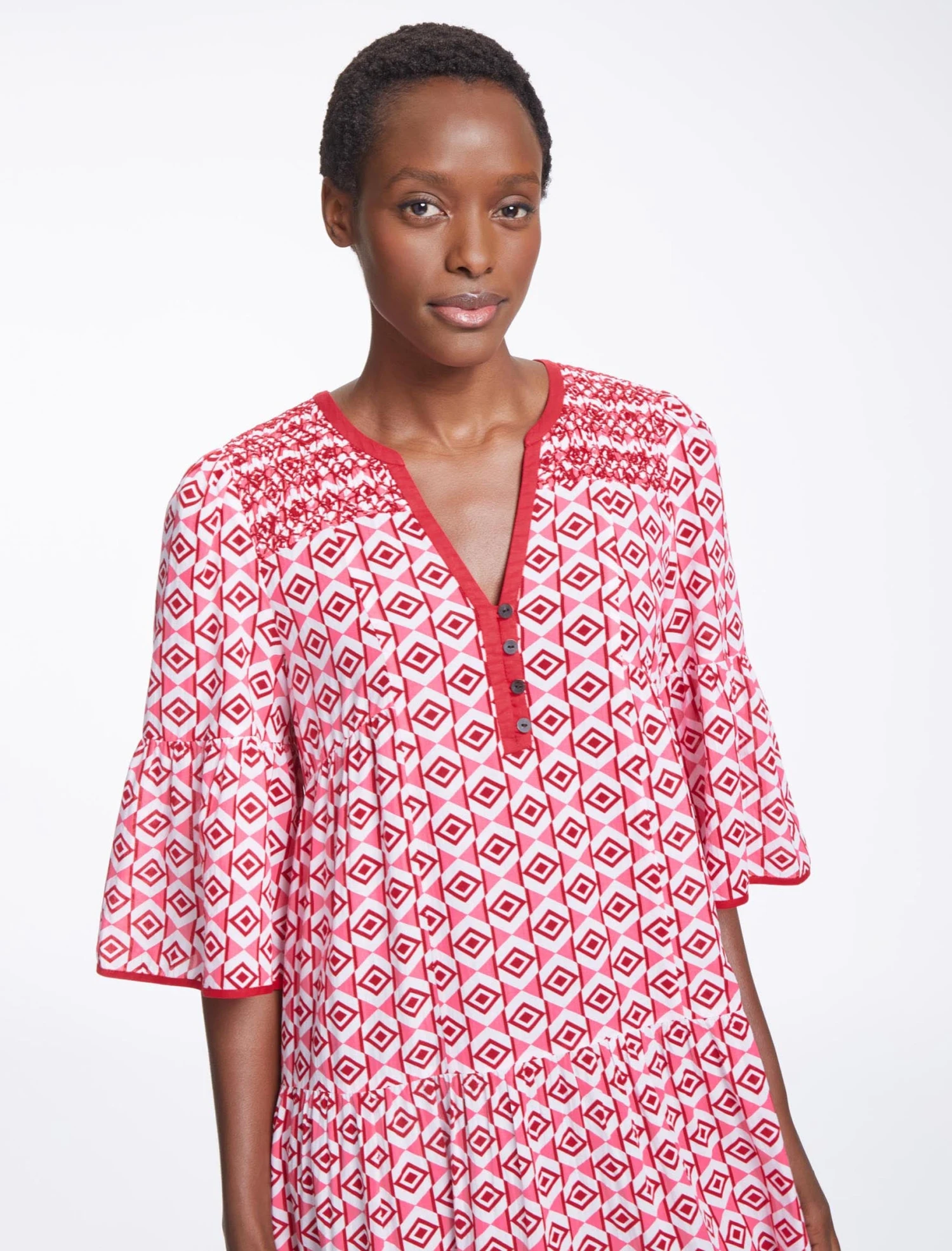 Who doesn’t love the glamorous ease of a kaftan on a hot summer’s day? Designed in a cool cotton blend, with our graphic geo print and hand-embroidered smocked detailing, Hester is shaped to a relaxed fit, with loose sleeves and a detachable sash belt, making it ideal for carefree days by the beach or in the park. Add giant sunglasses, flowing hair and some palm trees for all the Hollywood feels.