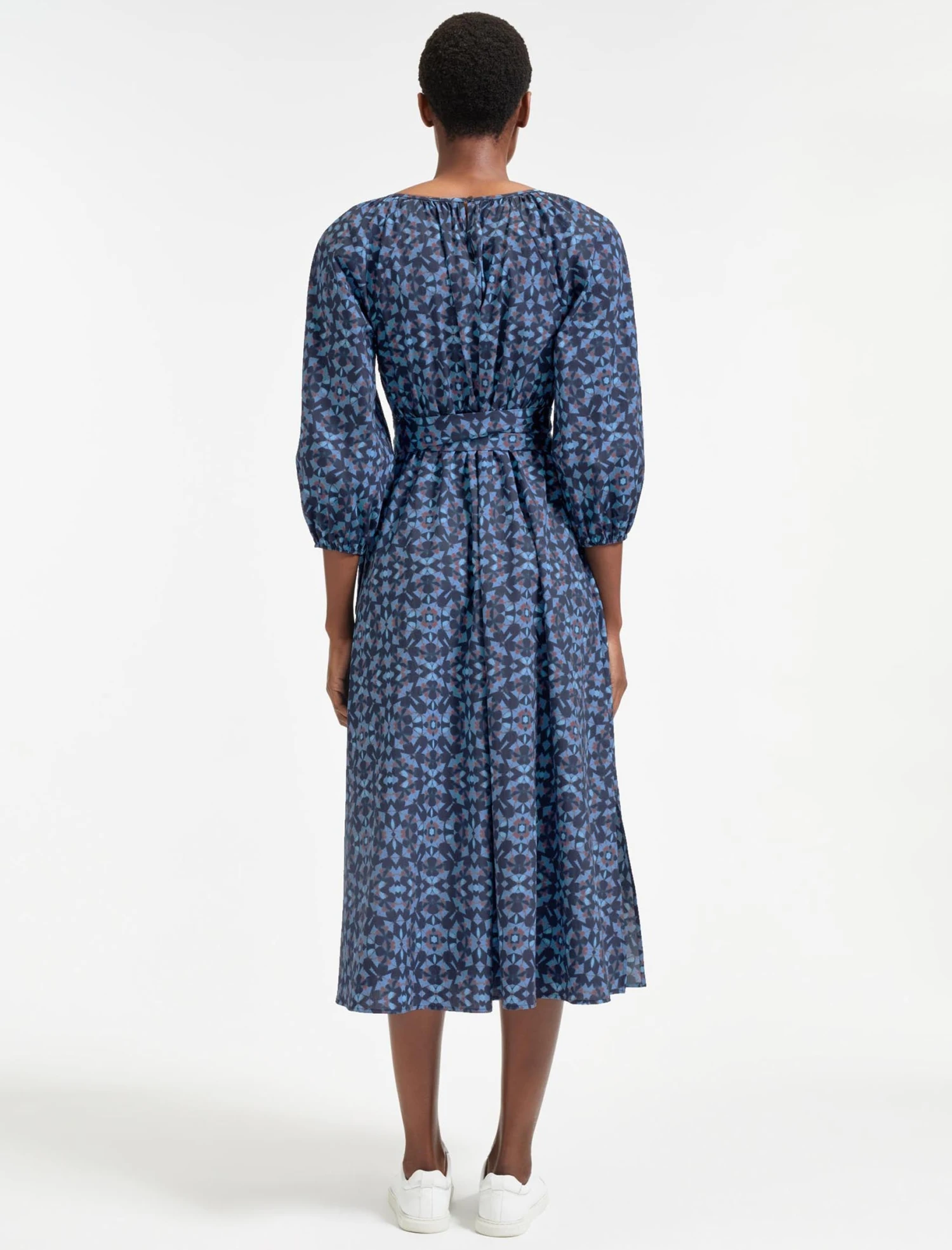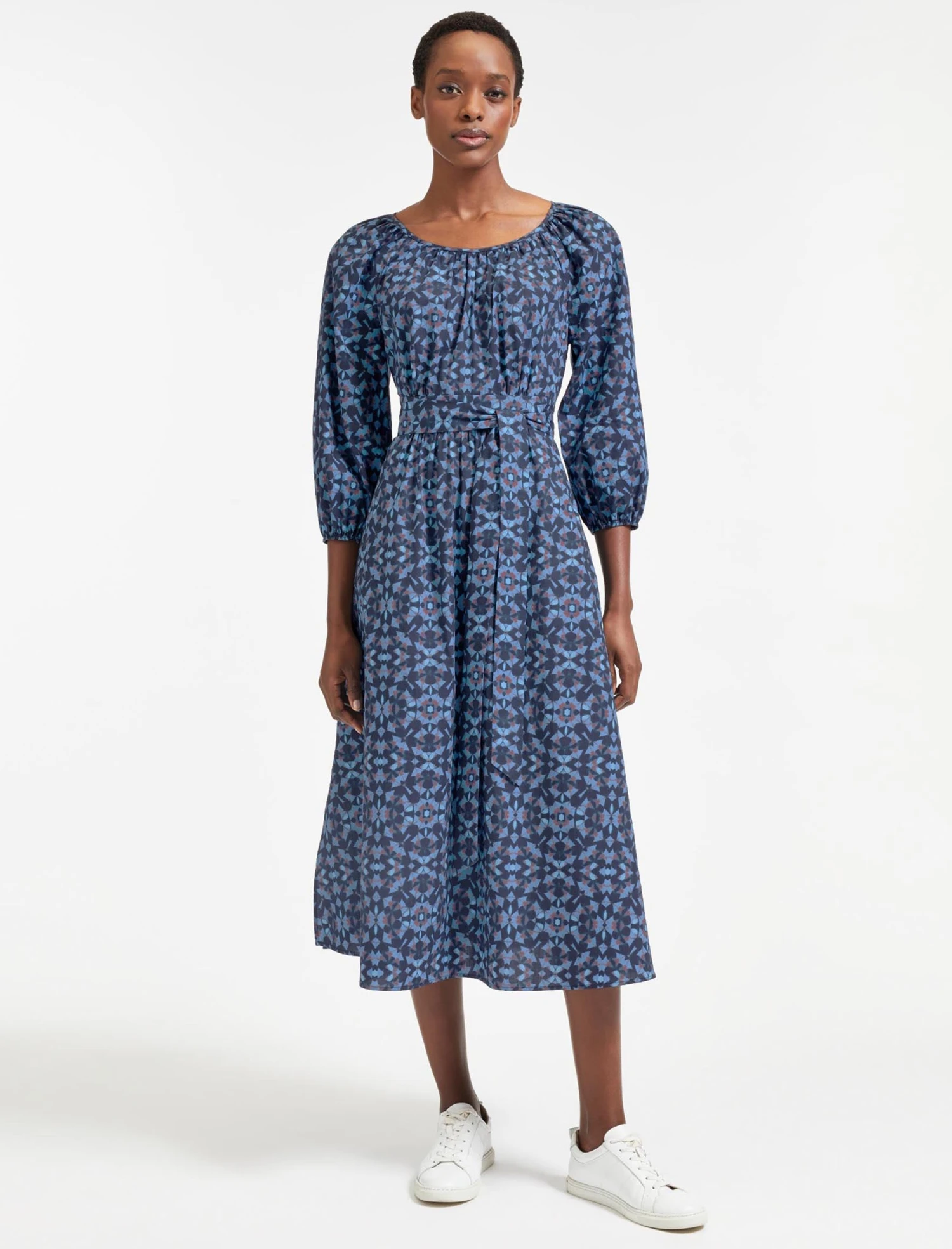 Your perfect everyday summer dress, Ingrid has been designed in our crisp cotton poplin in a sophisticated tie-dye-style print. The raglan sleeves, loosely elasticated waist and sleeves and wraparound belt ensure its endlessly wearable and universally flattering, all summer long. A must-pack for holidays with a sandal or trainer; take it into the cooler months with a tan or black boot.