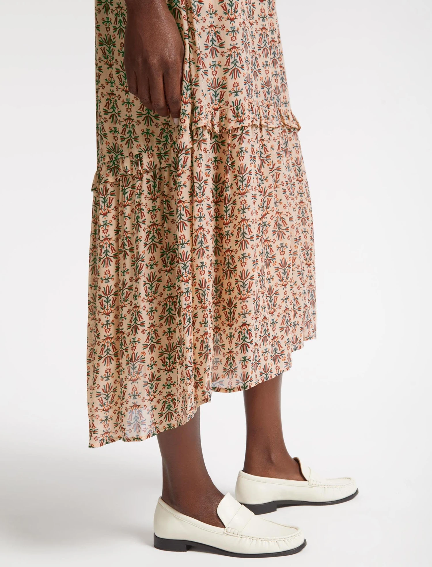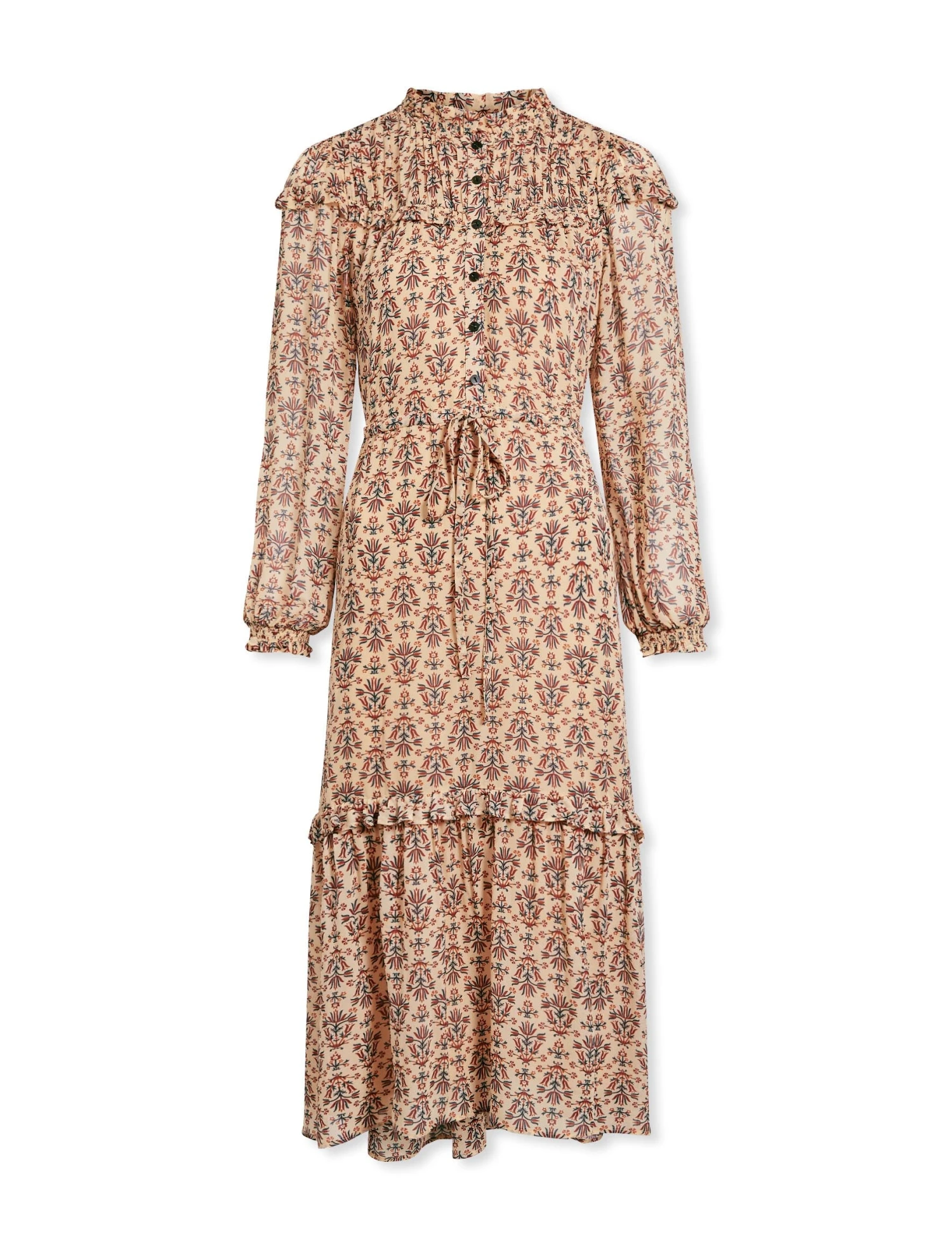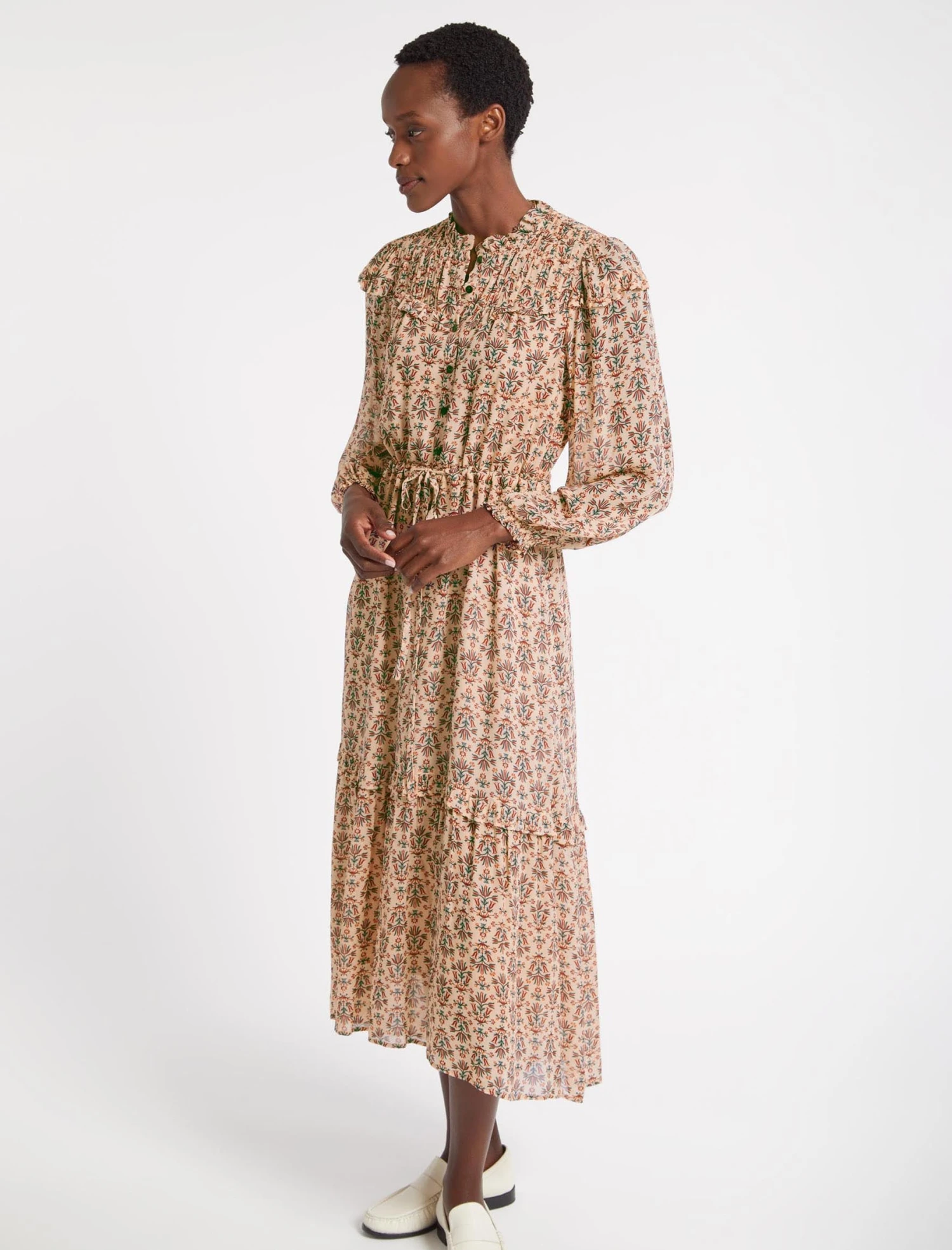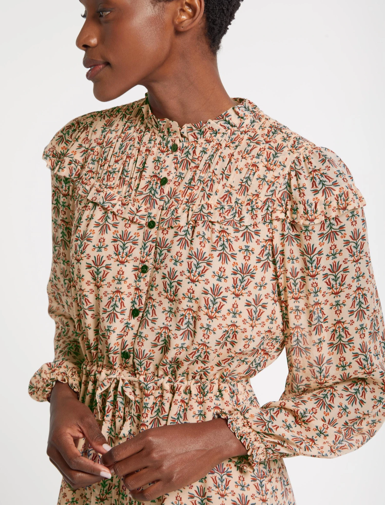 Get your spring feels courtesy of Isla. Designed in a delicate georgette blend, this unashamedly feminine design includes a pretty ruched yolke, drawstring waist and frilled detailing. While the folk floral print nods to warmer climes, the long, shirred sleeves and dipped hem mean it works just as well on chilly days.