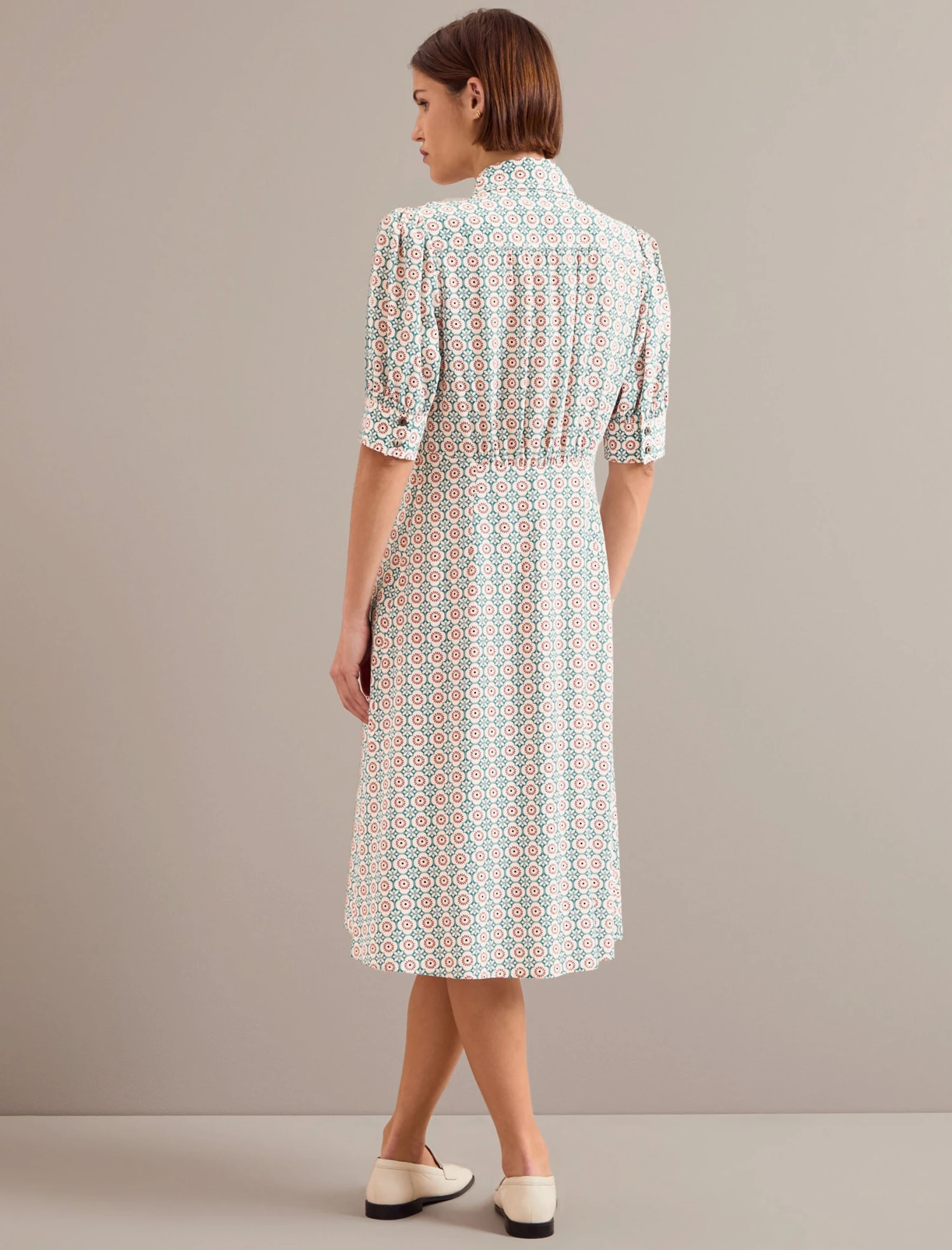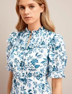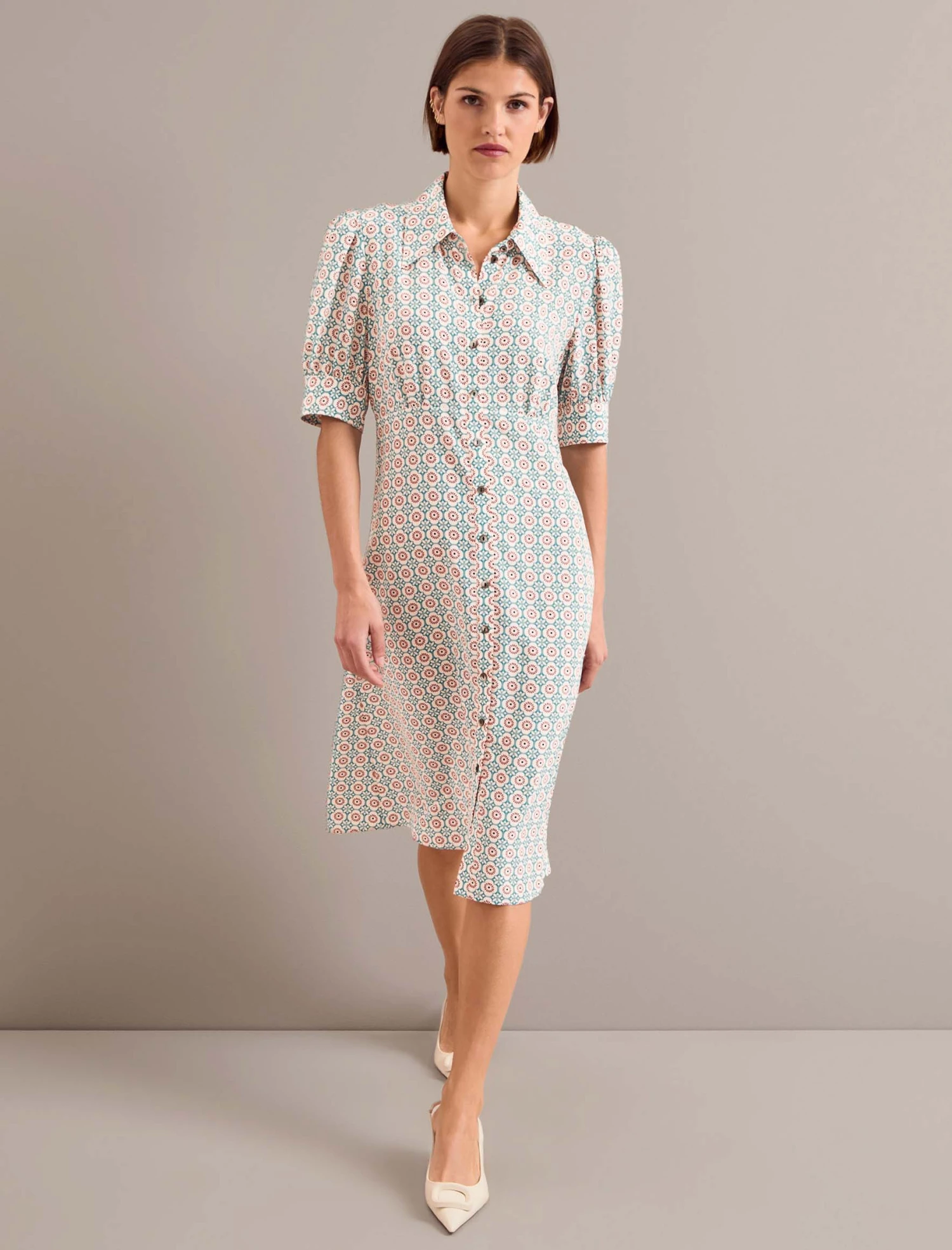 Perfect for petites or those who love a knee length, Ivy is your cut-above-the-rest tea dress. Designed in the highest quality silk crepe de chine, the sharper collar and cuff are softened by the pretty gathered sleeve and yoke. The summarys are stitched down through the bust and waist to prevent gaping but can be opened at the bottom for extra sexiness.