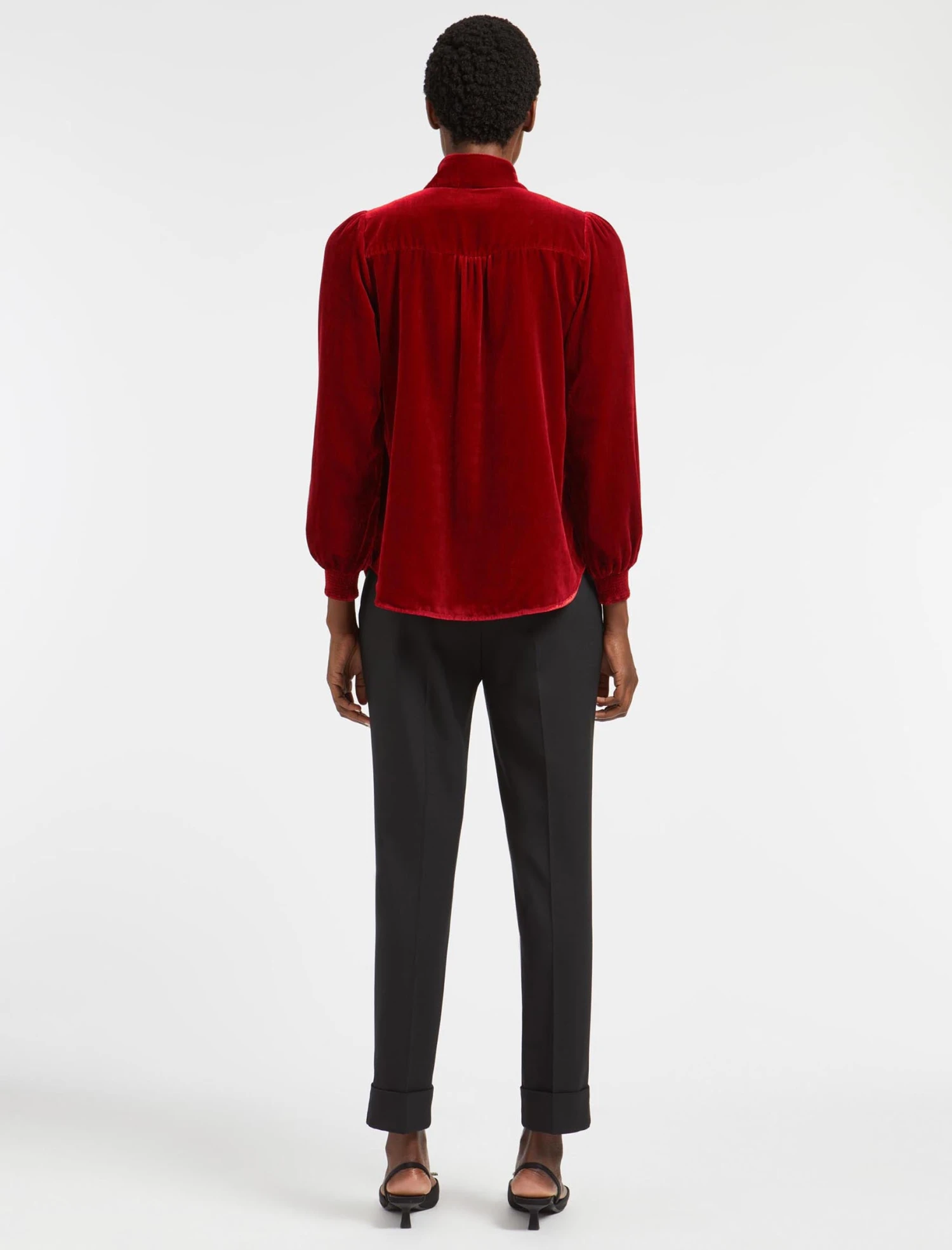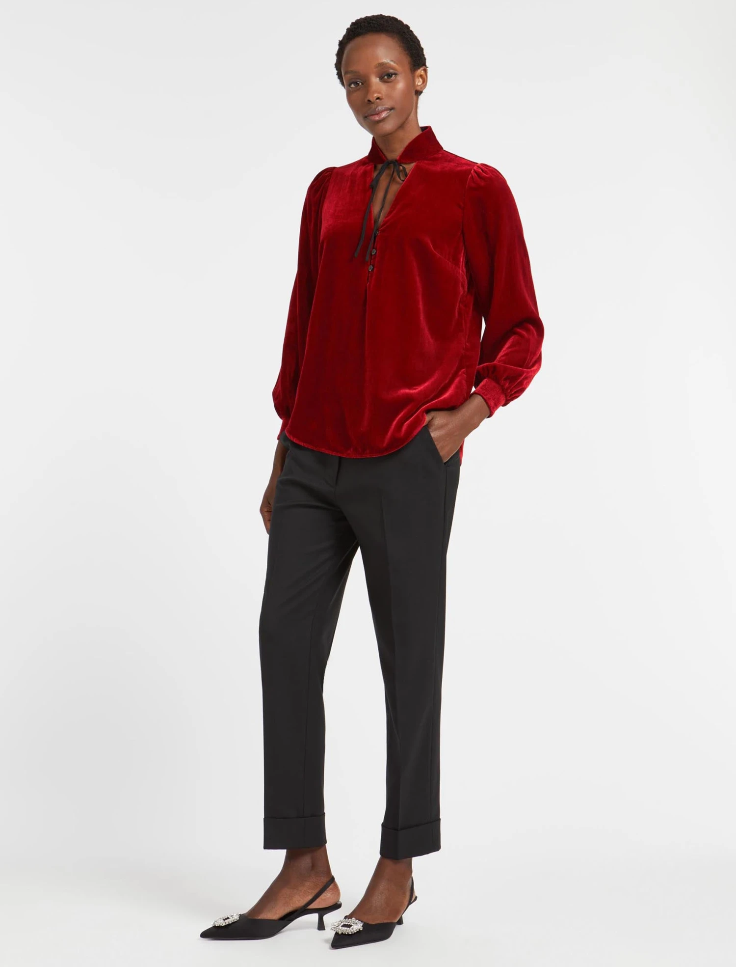 Designed in rich jewel tones that will look chic year after year, our Jacquetta blouse features feminine touches including the pretty long shirred sleeve and rouleaux summarys. The necktie can be worn loose and turned down or tied as a choker, depending on your mood. Get the party started with a leather skirt or tailored trouser and a killer heel.