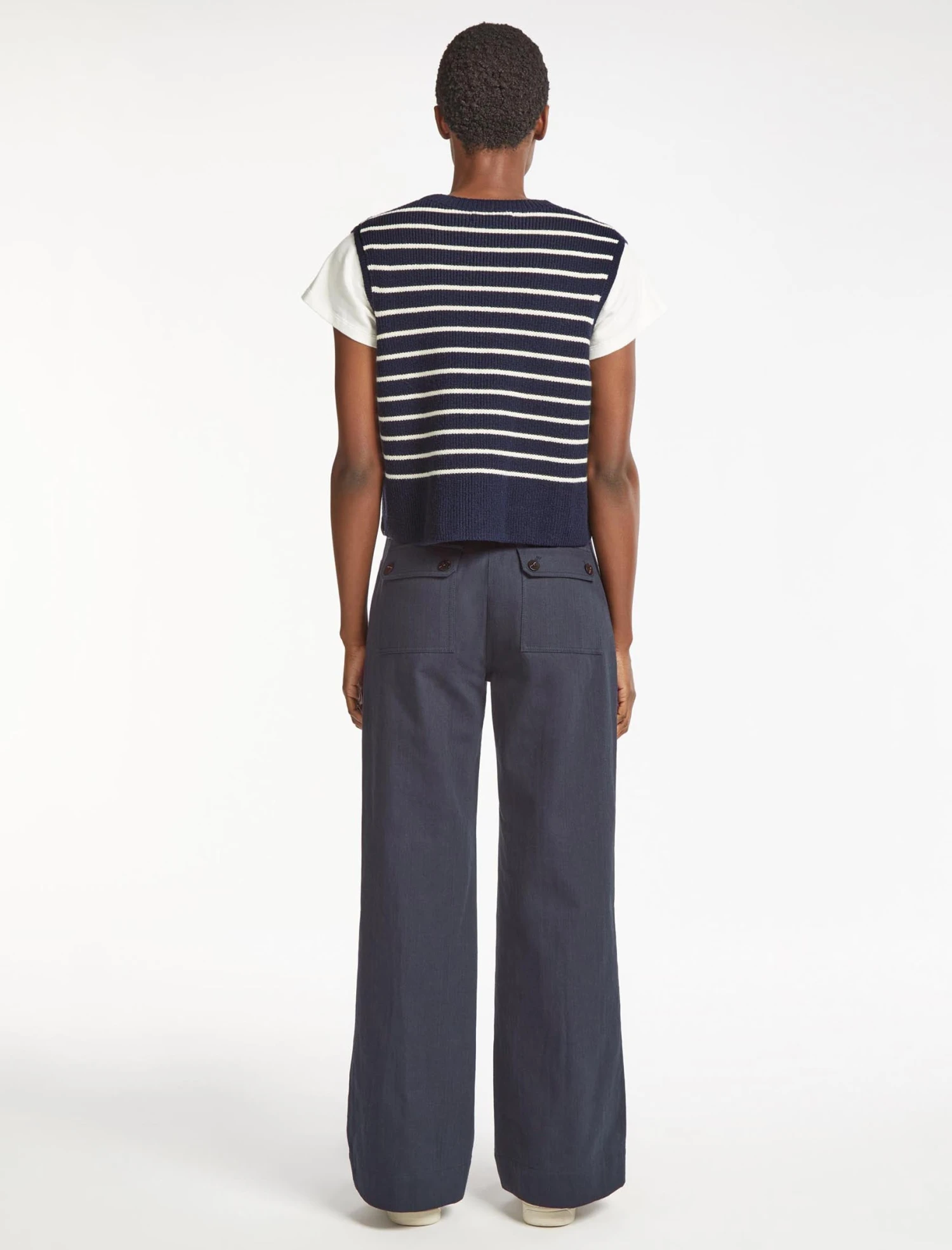 A versatile and lightweight alternative to our winter vest knits, Julie is designed in a cotton-and-merino blend that’s soft to the touch and cool on the skin. The wider shoulders and boxier fit mean it can be worn alone or layered over a T-shirt such as Madison or Pippi shirt with our skirts – Sierra and Sidney – or Hayden trouser.