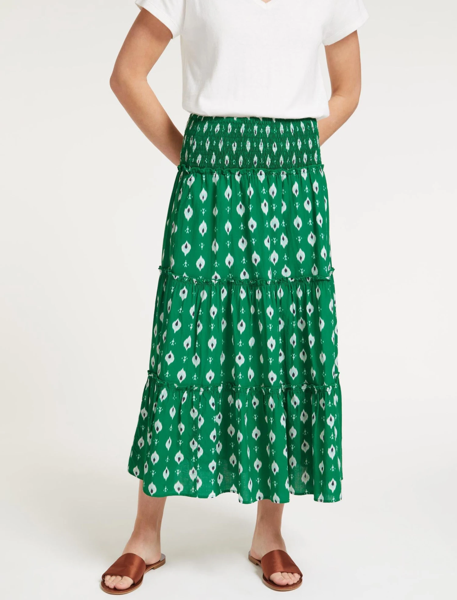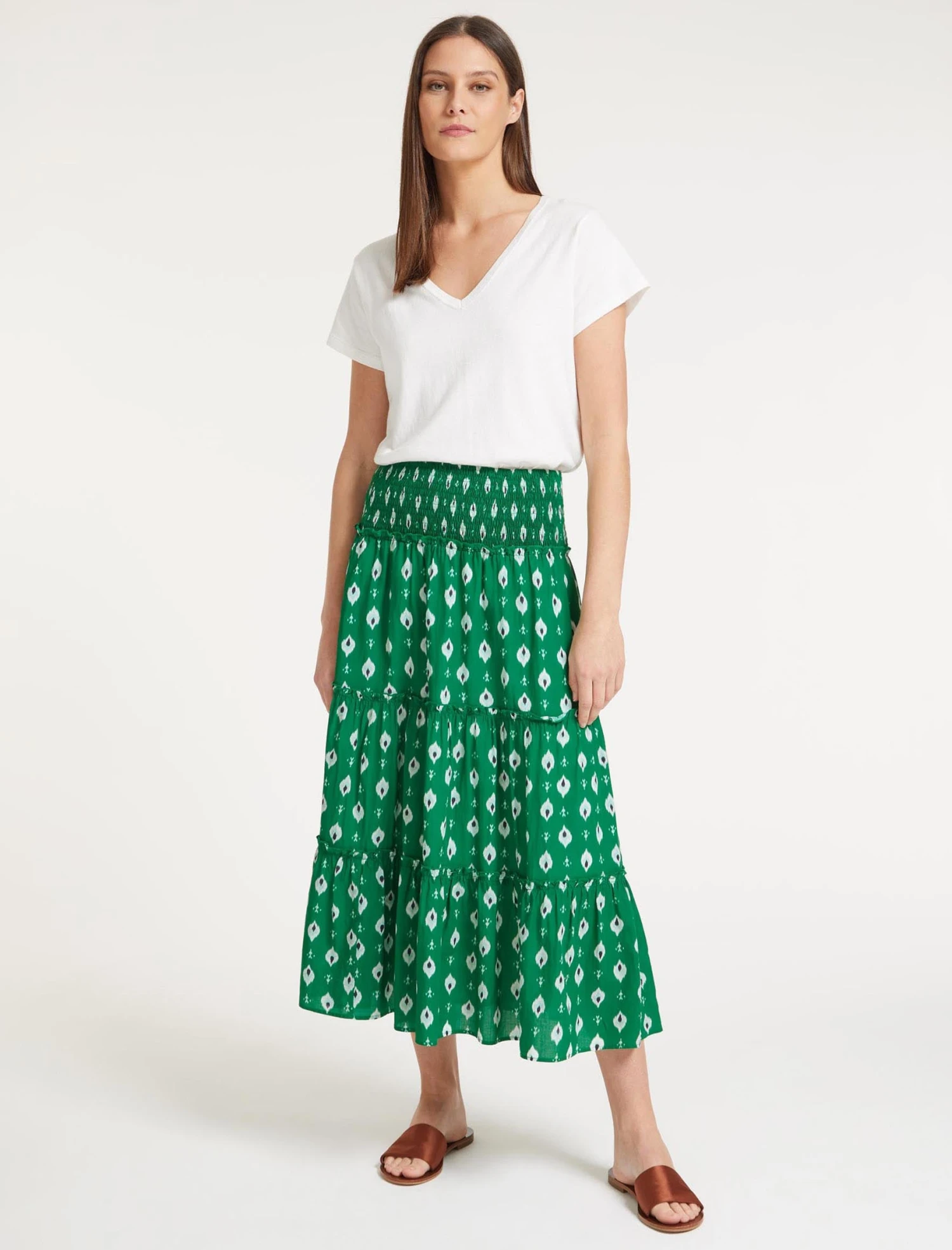 Slip-on styles make summer dressing a breeze. Enter our new Kira skirt, which feels light and comfortable to wear and effortless to style. Designed in our graphic Ikat print, it’s shirred waist, tiered skirt and baby-locking frills add a hint of femininity. Team with a neutral T-shirt or our Kyla cami and a simple sandal or trainer for low-key weekend outings or beach days.