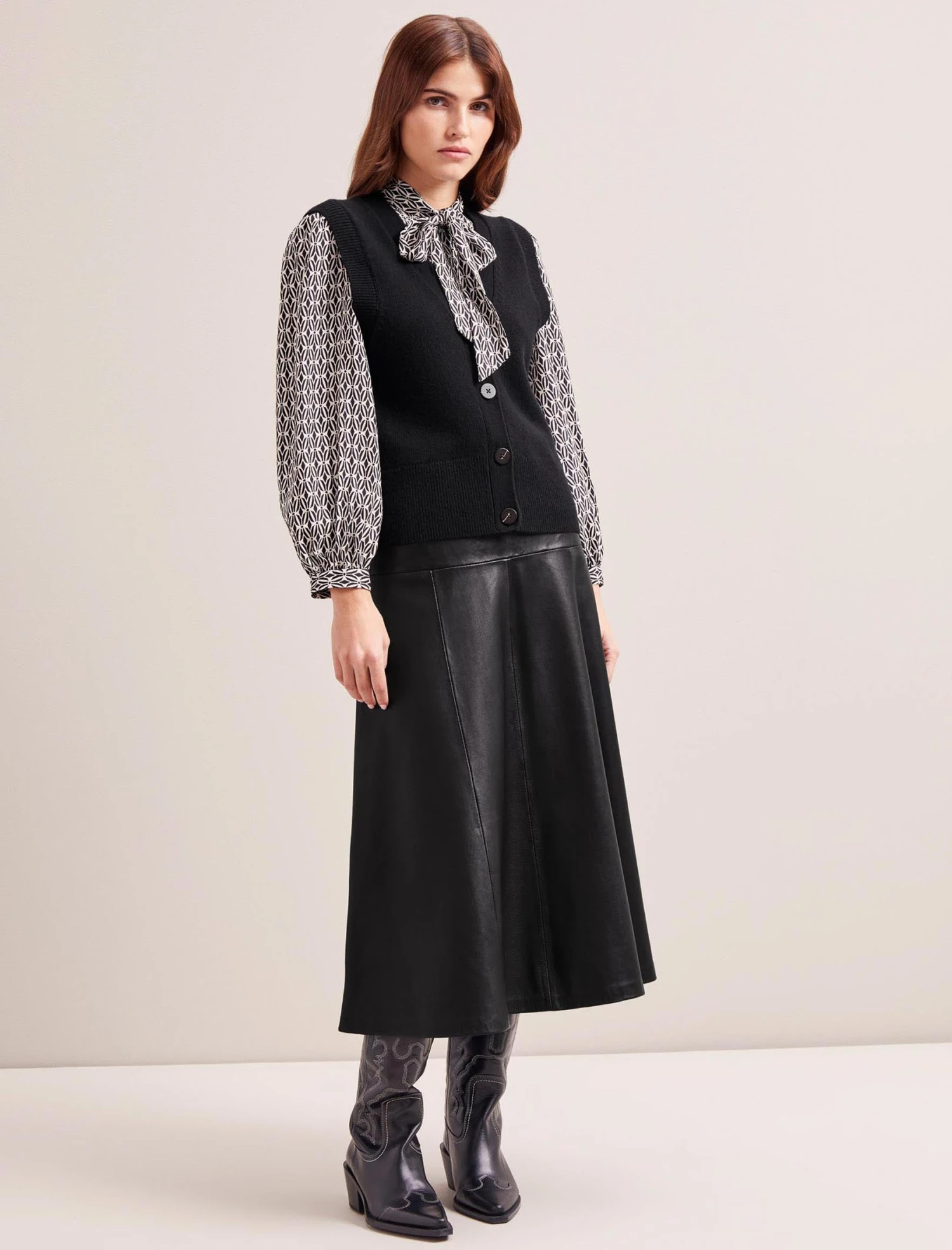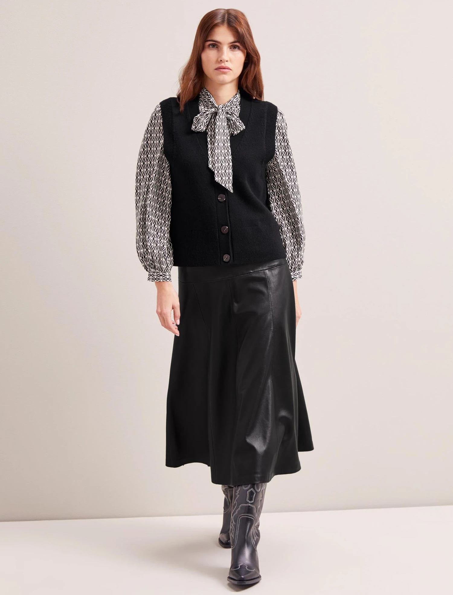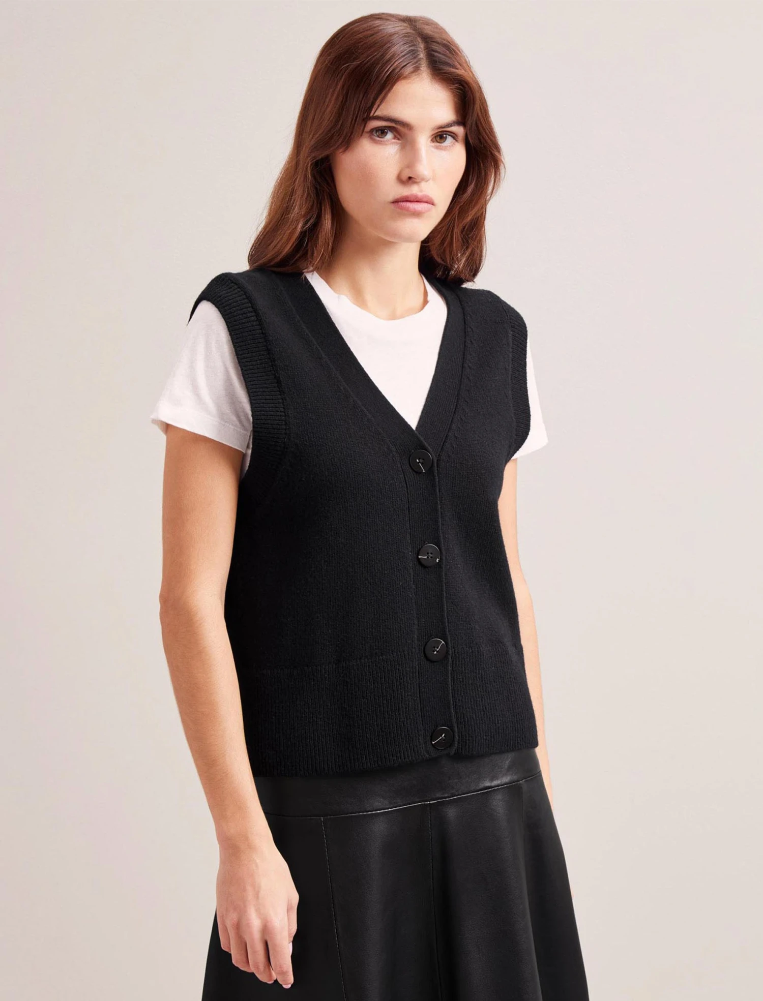 The perfect year-round layering staple, we’ve designed Meryl in a classic black wool blend. Whether worn under a blazer or alone (summaryed or undone for a more androgynous look), the flattering knitted waistcoat silhouette and fitted armholes fit snugly over dresses or long-sleeved tops. Complement the on-trend knit with our classic leather Tiana skirt and a silk shirt.