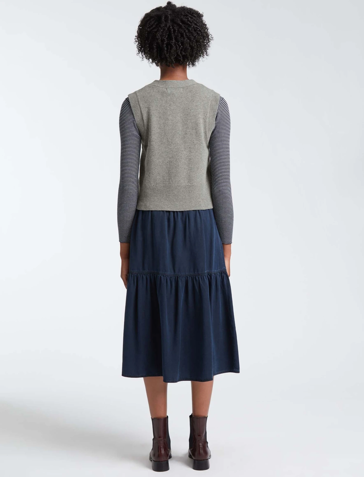 The perfect year-round layering staple, we’ve designed Meryl in a classic grey wool blend. Whether worn under a blazer or alone (summaryed or undone for a more androgynous look), the flattering knitted waistcoat silhouette and fitted armholes fit snugly over T-shirts or long-sleeved tops. Contrast the on-trend knit with our crisp Techni-Linen Hayden or Tate trouser or Lyla skirt.