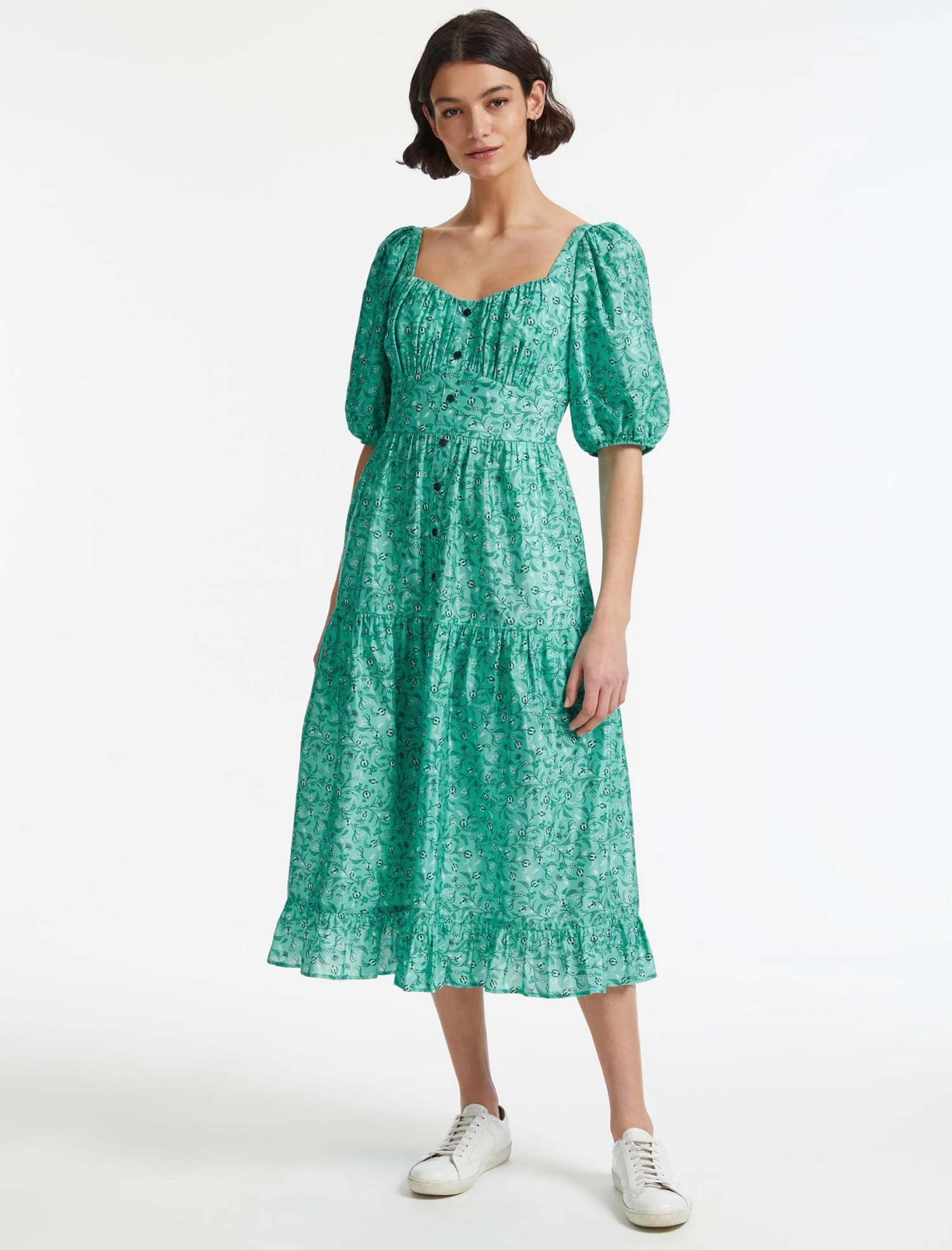 Designed in a breezy cotton blend in our pretty green trailing floral print, our flirty Paloma dress will be your go-to summer favourite. Made with a lightly fitted bodice that’s shaped with a gathered bust and puffed sleeves, it falls to a softly tiered skirt. Shirring on the back and a fixed sleeve with loops to keep your bra straps concealed give it everyday wearability. Play into its femininity with a pretty sandal and undone hair.