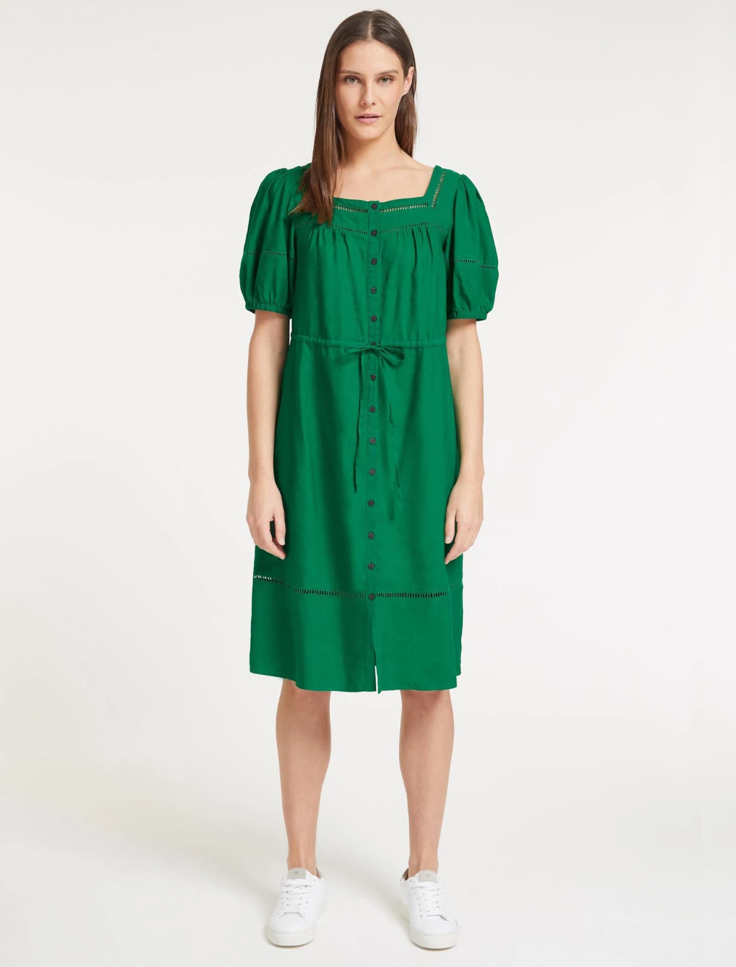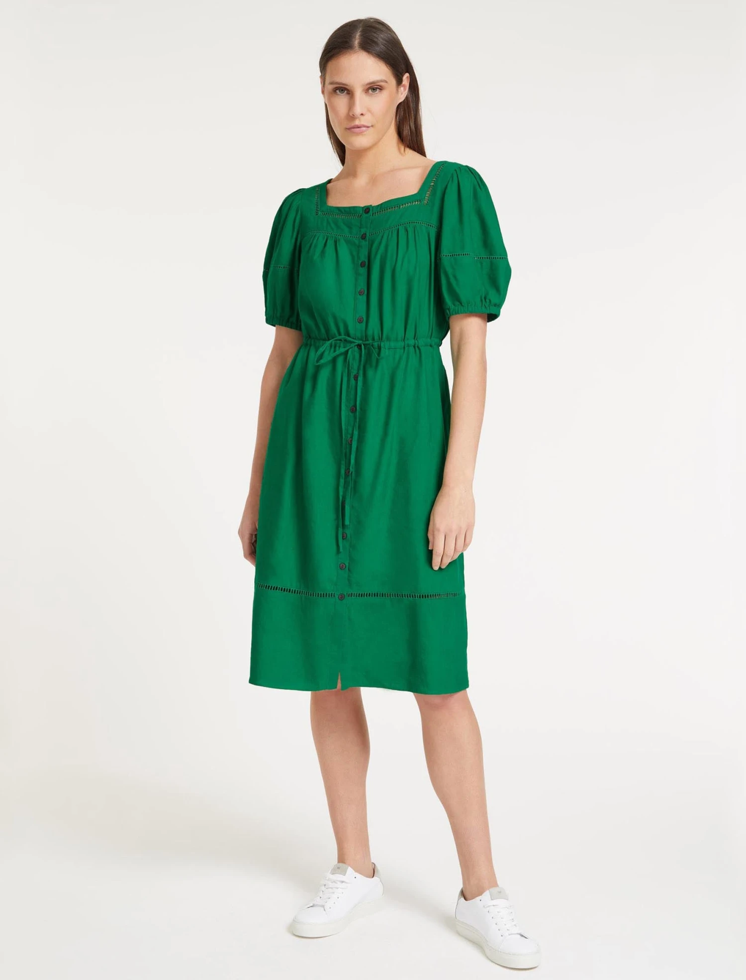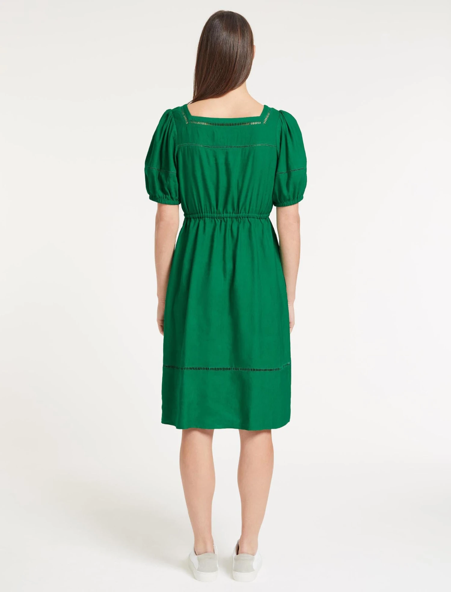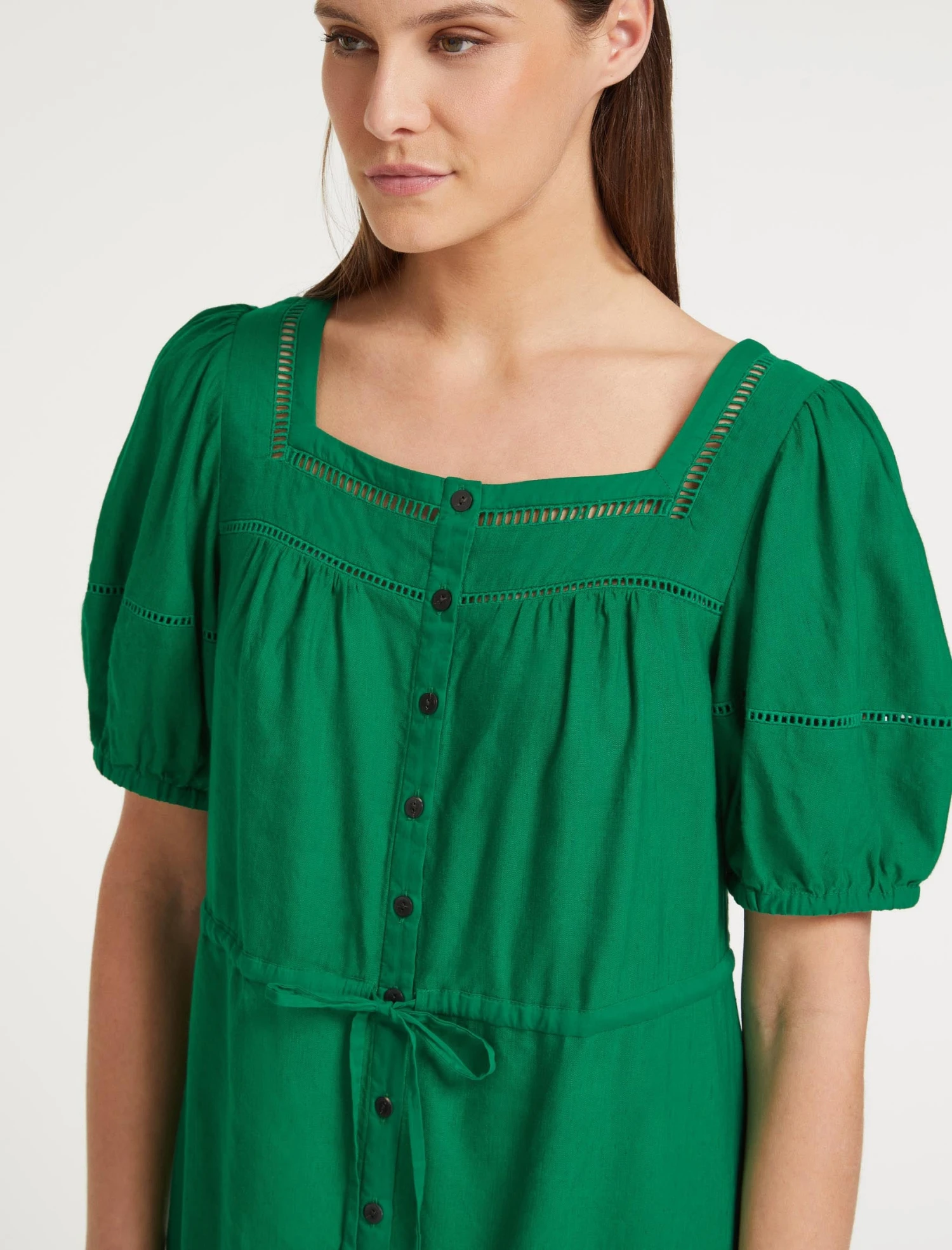 Reminiscent of 1950s British summertime, our Poppy dress is made for sun-drenched days. Designed in our brand-new, machine-washable linen blend in our emerald and white colourways, it will keep you feeling cool and collected. The elasticated puff sleeves, ladder trims, square neckline and summary-through placket (undo at the hem for a flirty, carefree twist) add to its nostalgic sensibility.