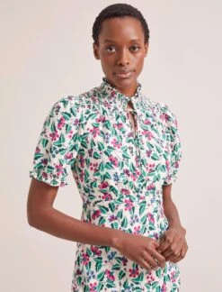 Cordelia Cotton Blend Maxi Dress – White Green Tudor Rose Print