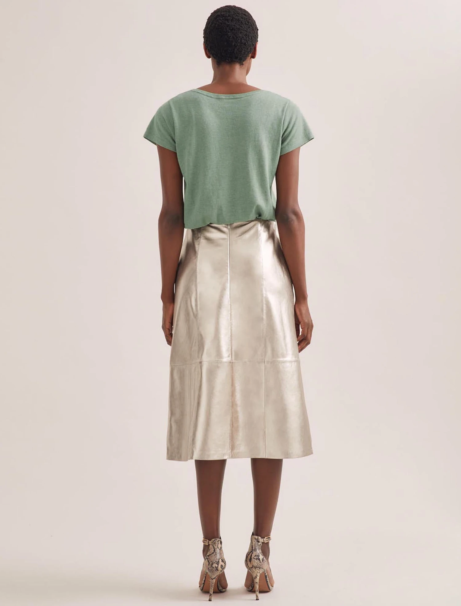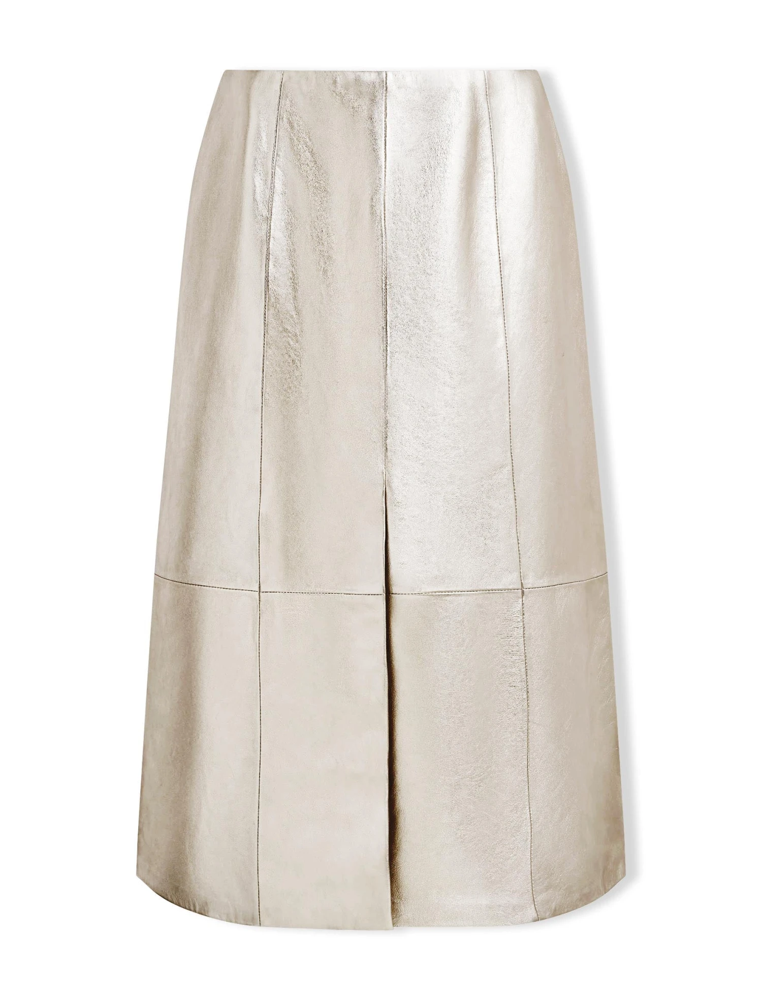 The latest addition to our lauded leather skirt collection, Robyn is a stand-out metallic pencil skirt. Designed in an on-trend light gold, it looks super-chic styled with white, cream or taupe neutrals and works equally well with gold or silver accessories. Wear now with a strappy heel for sundowners or switch up with a boot to give it new life long beyond summer.