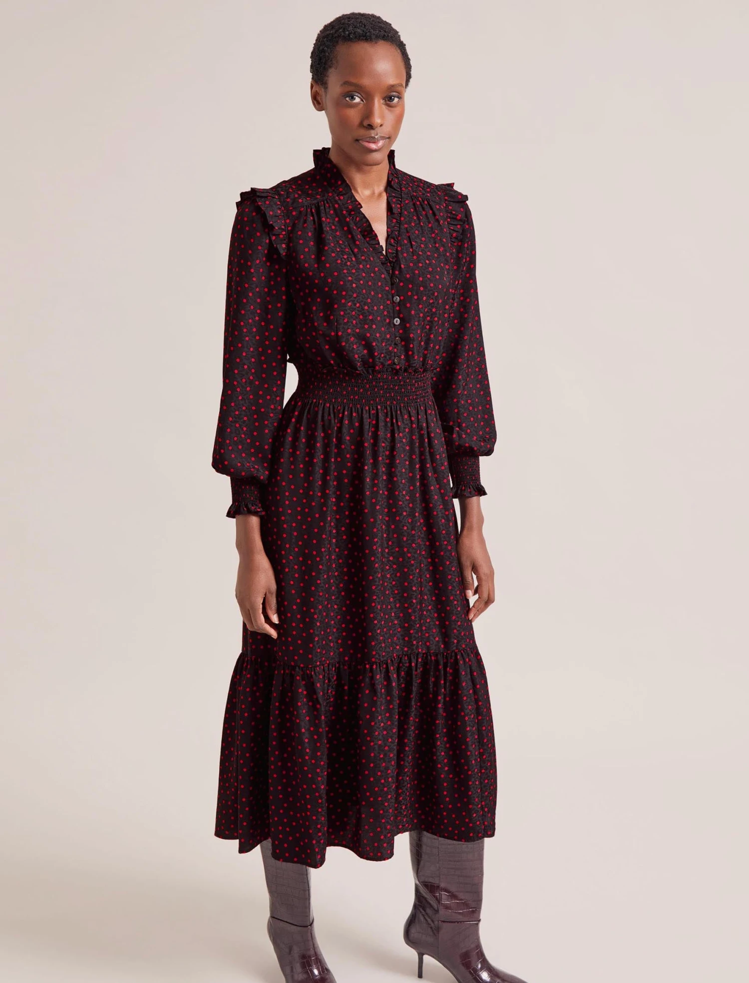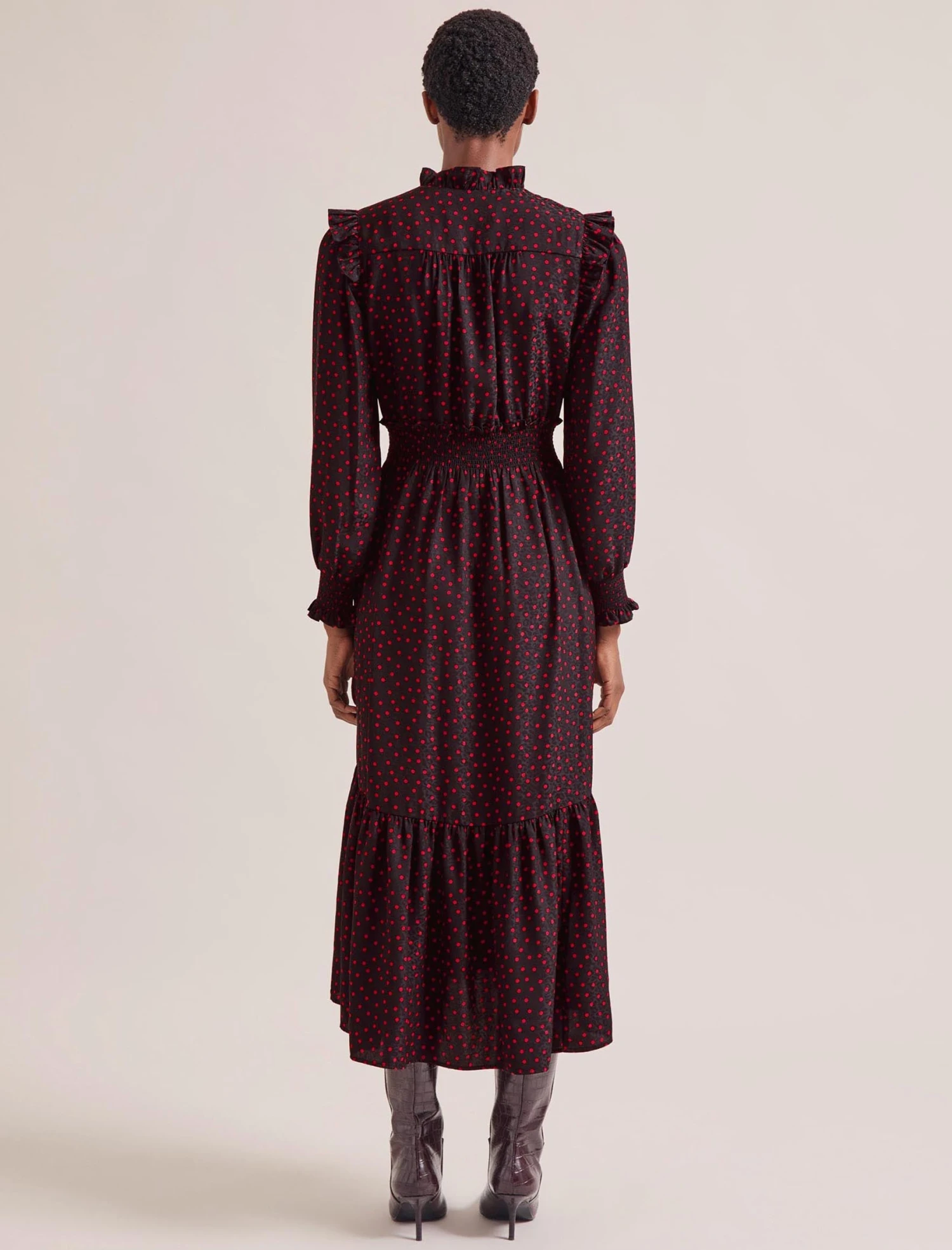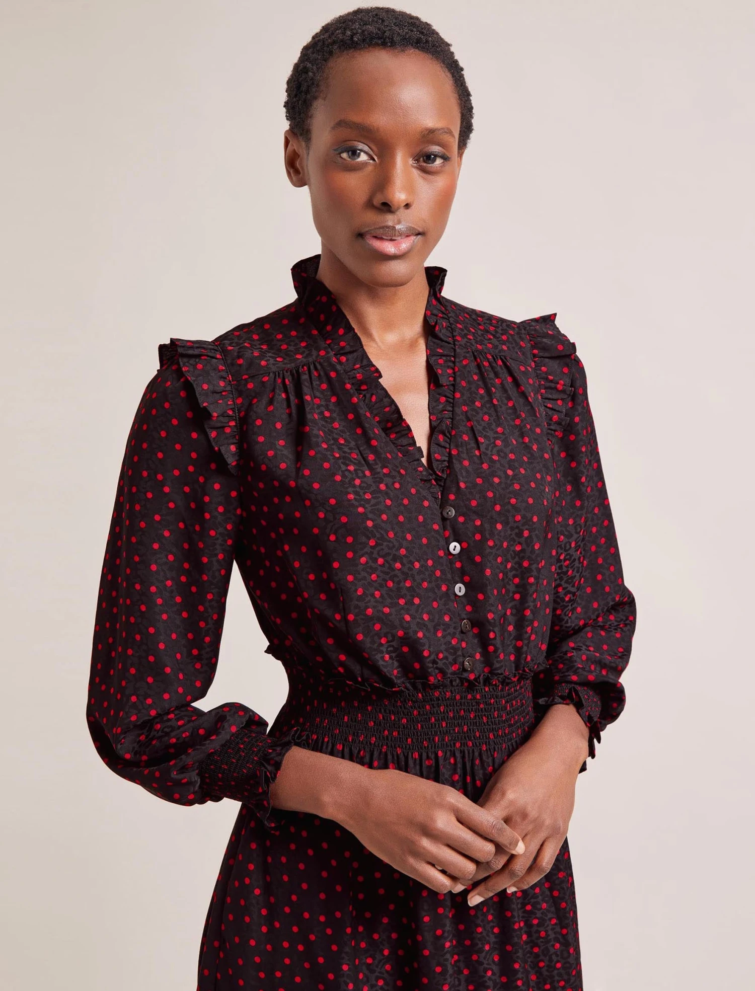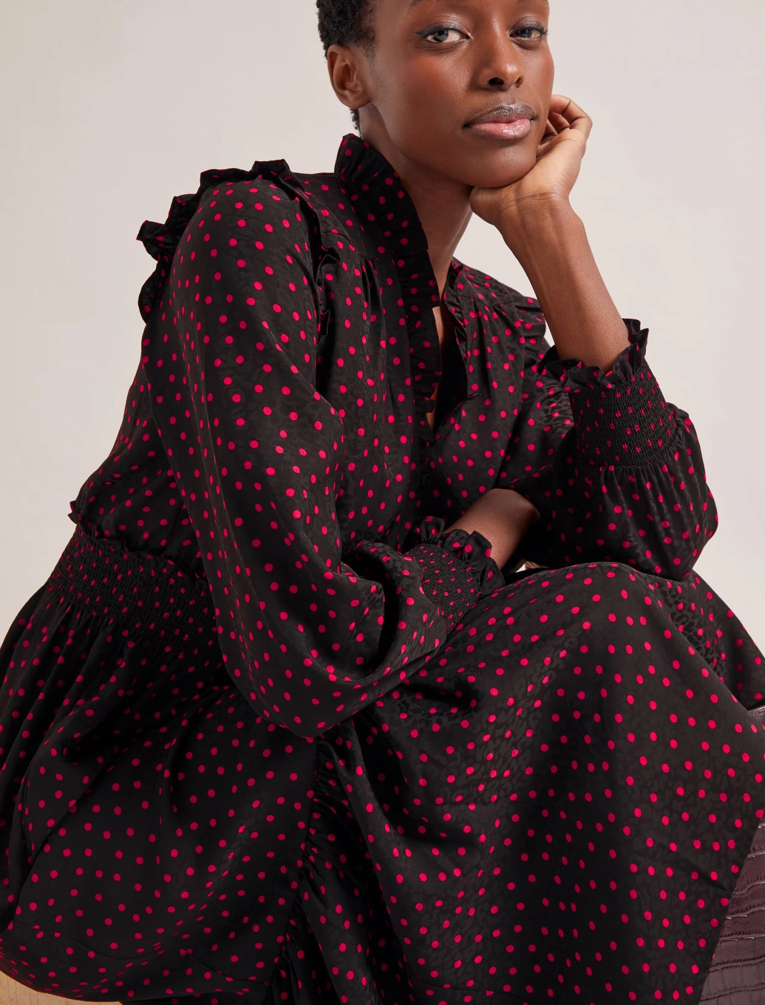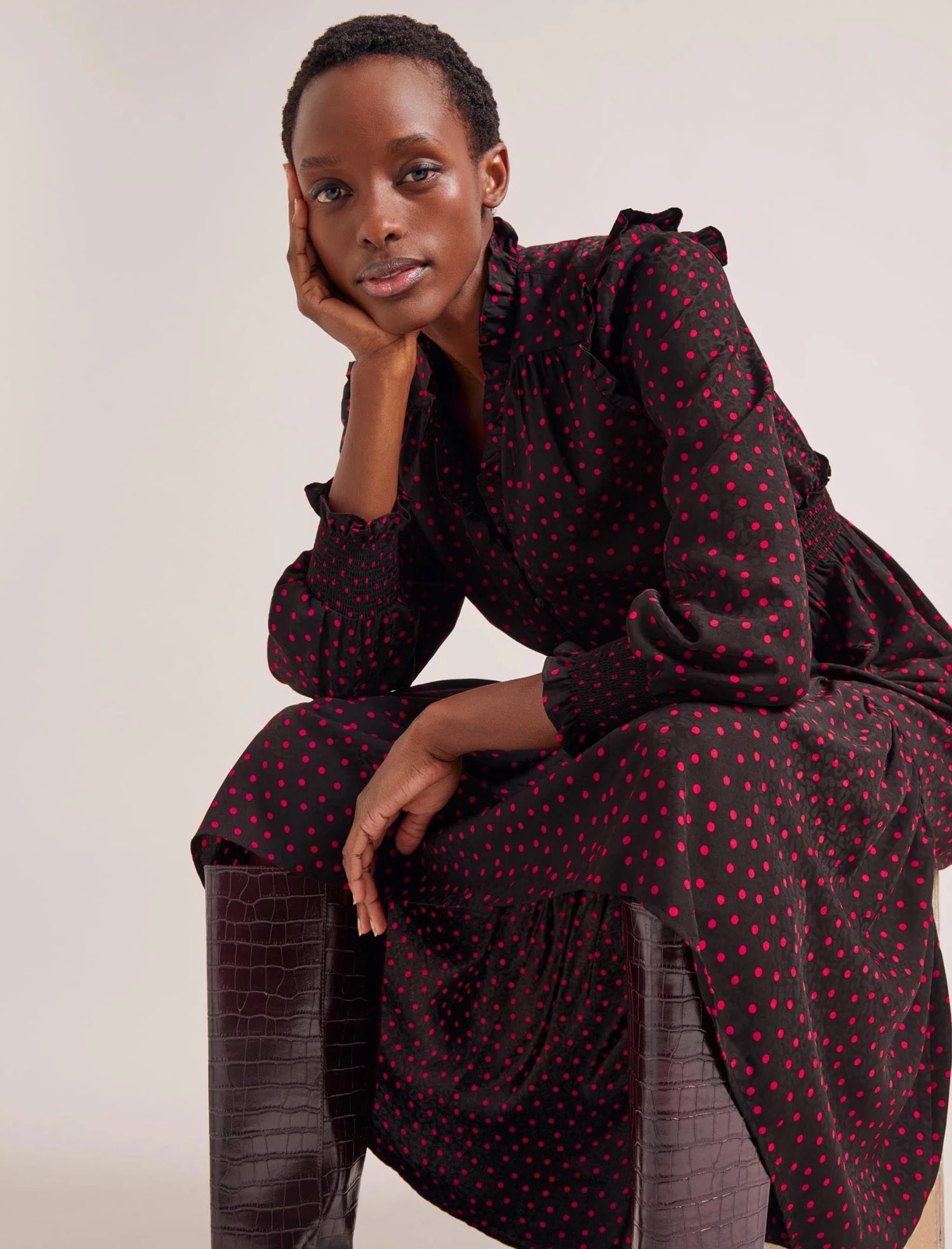 Miss the ease of summer’s throw-on-and-go dresses? Well, Saskia is your cool-weather alternative. Designed in a polka-dot-print jacquard with elevated detailing, it has a shirred waist and billowy sleeves for effortless everyday wear. Stash it in your commuter bag, throw it on as you’re racing out of the door, pack it for a work trip… no sweat: Saskia is crease-resistant and machine washable.