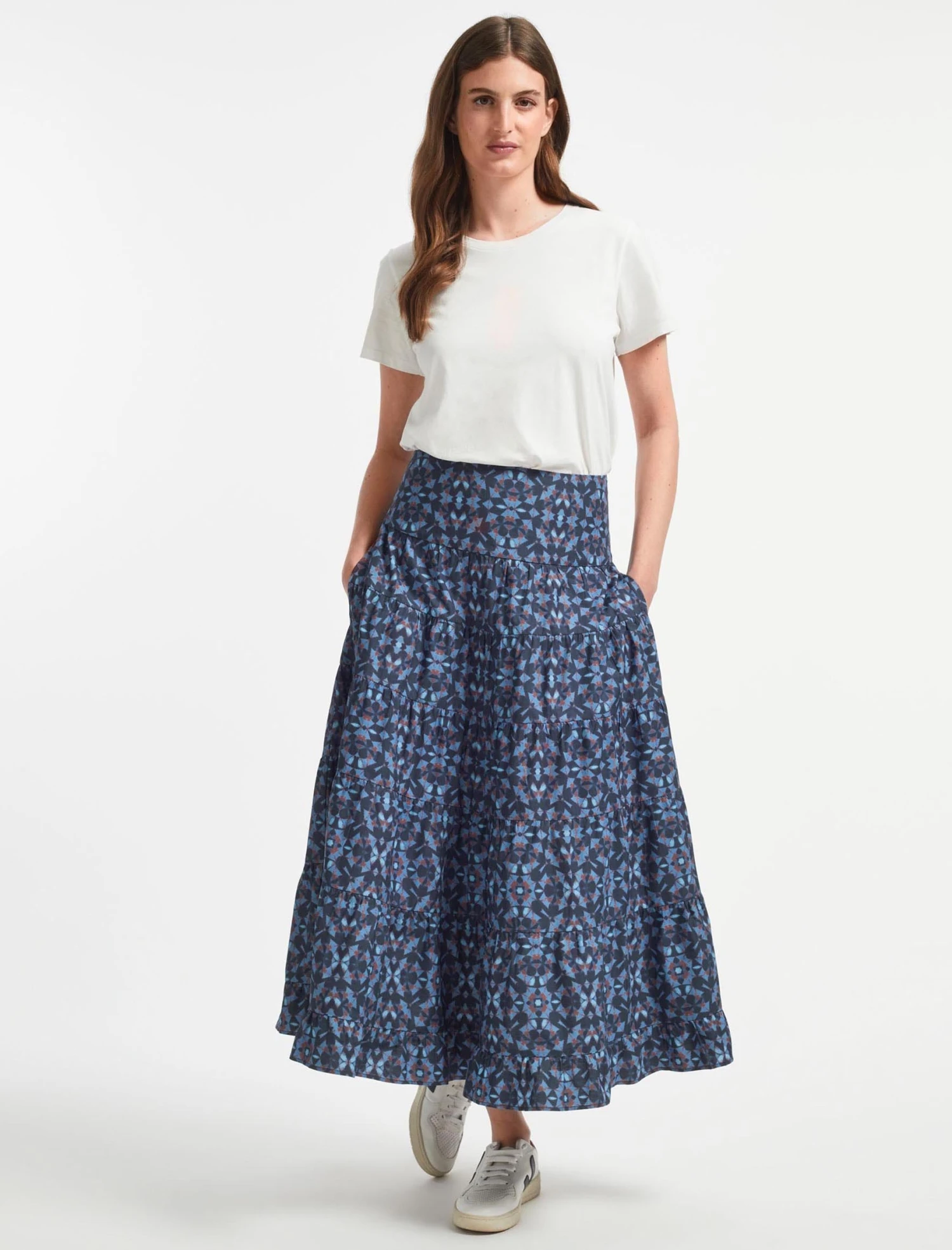 With all its boho charms, a maxi skirt is a classic pick for relaxed summer days. Our tiered Sawyer design has been cut from an organic cotton poplin in a bold print – ideal for adding a graphic edge to wardrobe basics. Team with a simple white T-shirt and trainer for run-around days, swapping to one of our Eva knits and a classic ankle boot come autumn.