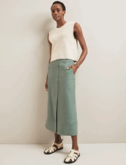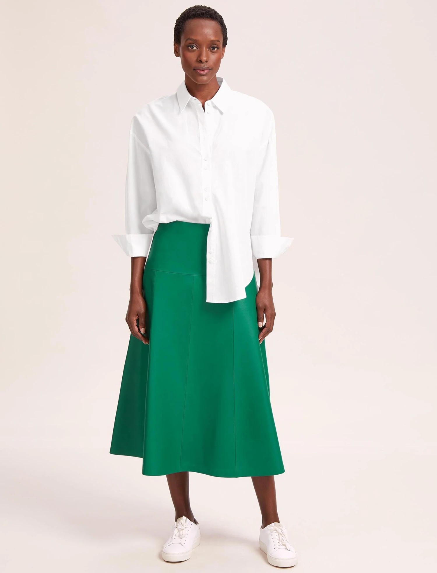 Summer calls for colour pop, so this season our much-loved Sierra leather skirt returns in a suits-all-skin-tones Emerald Green. The neat, dropped waist and fluted full skirt make Sierra perennially chic and so easy to style with our lightweight knits. For maximum style points, pair with a crisp white oversized shirt for a minimal and modern way to wear leather.