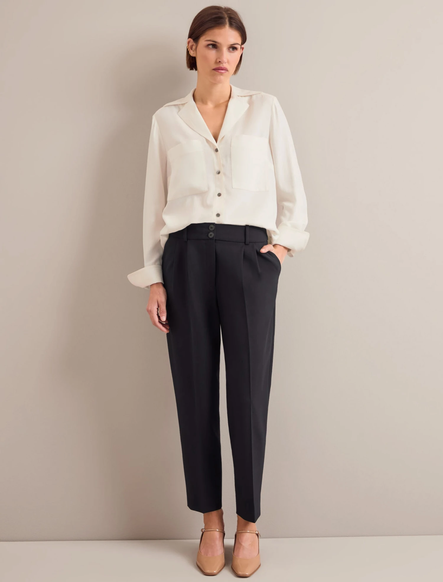 A cream silk shirt is a true wardrobe hero and Spencer will add androgynous cool to just about anything you wear it with. Cut in a matte washed silk that is beautifully soft and drapey, the on-trend 70s-style collar delivers a flattering neckline and the deep cuff can by folded back for a relaxed luxe look.