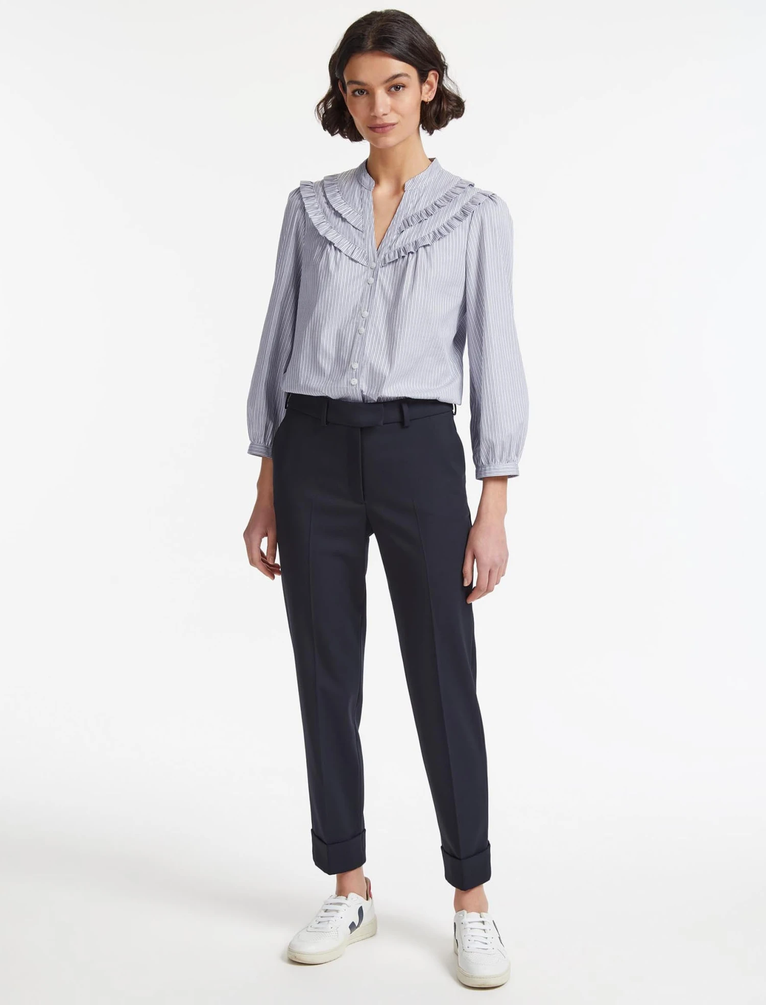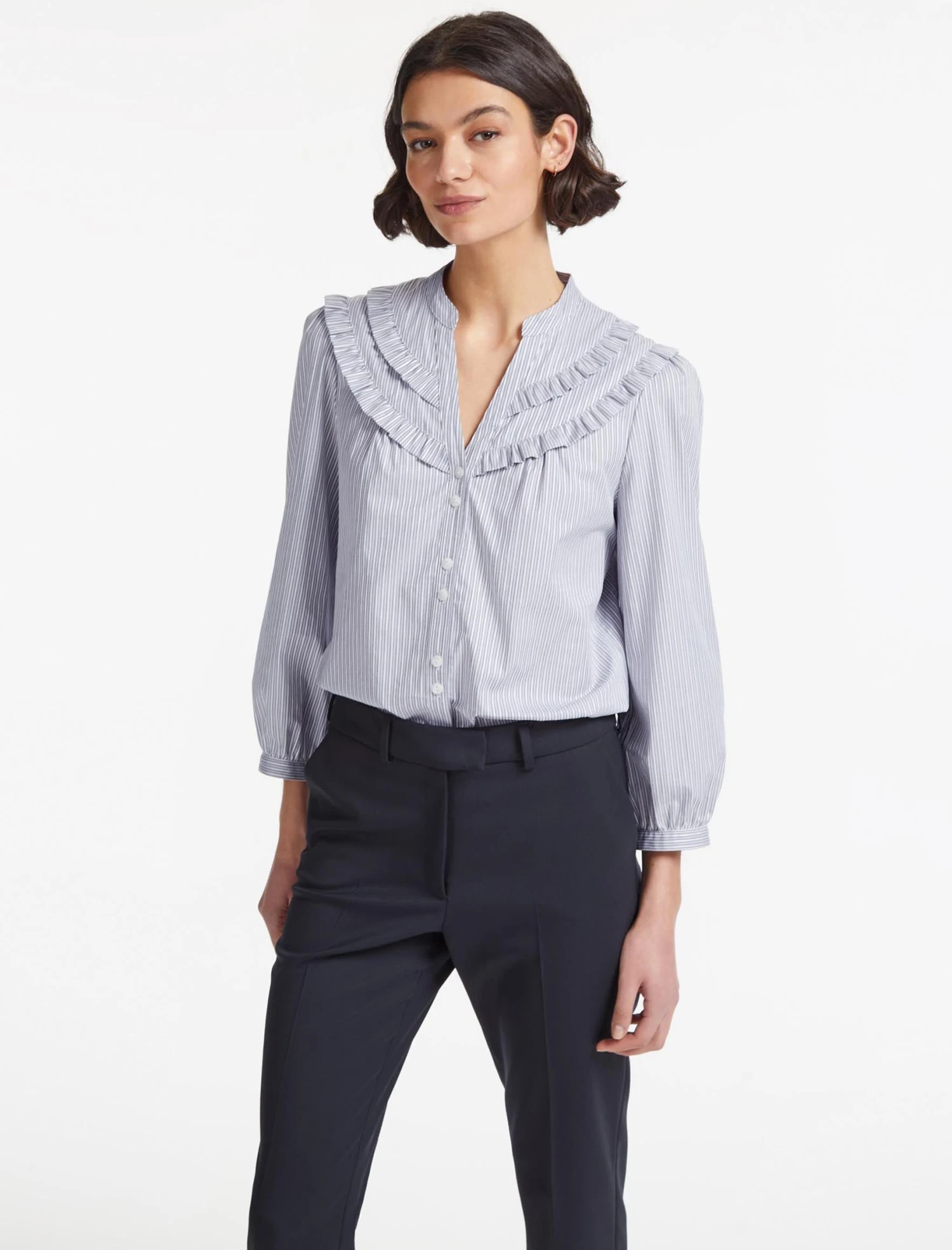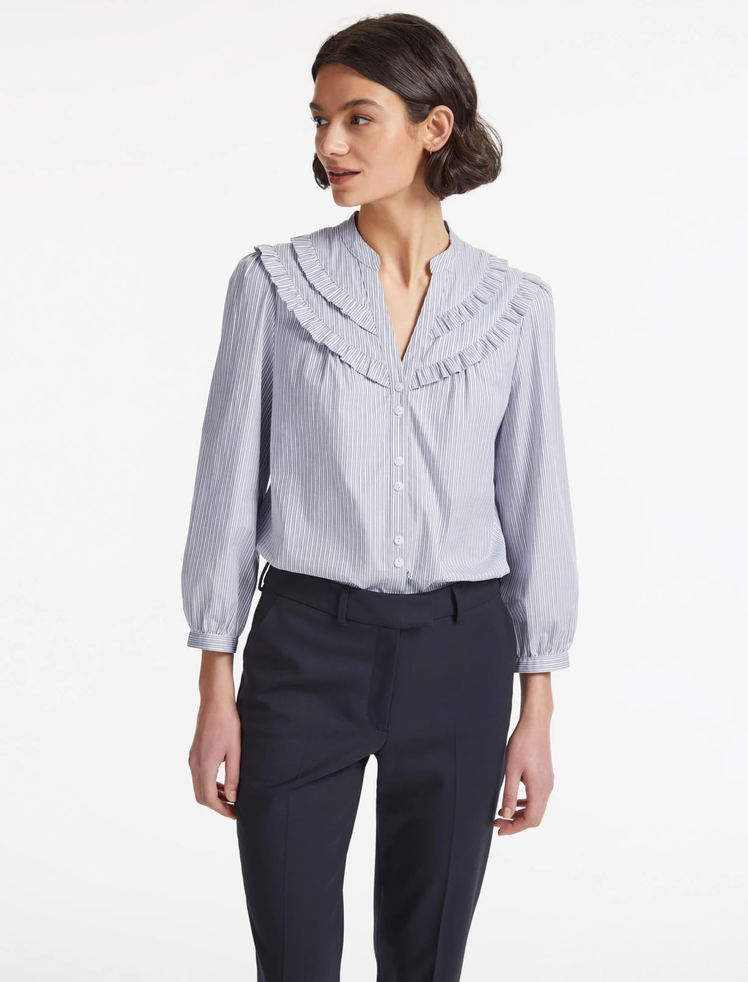 A feminine take on shirting, our Suki is made from a blue and white organic cotton with a jacquard stripe that elevates it from basic to smart. The pretty decorative frills give it a feminine spin while the slim gathered sleeve works well under a jacket. Softly shaped through the waist, it looks great whether you wear it tucked in or loose, dressed up with a tailored trouser, or dressed down with jeans.