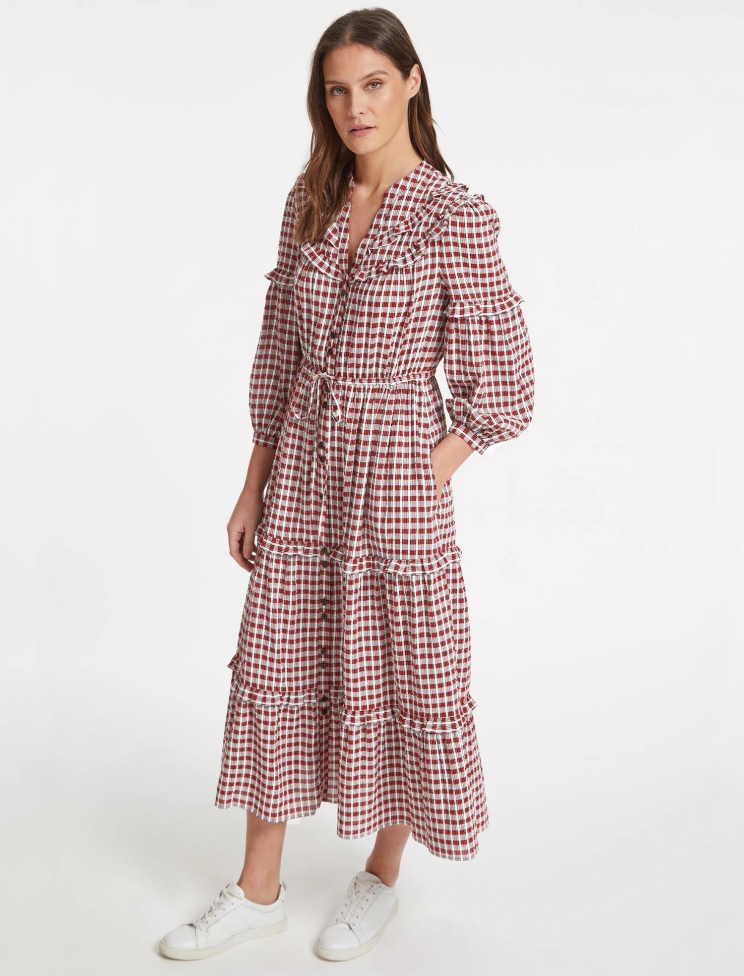 The maxi version of its midi sibling, this Suki dress is made from a cool organic-cotton-blend seersucker fabric in a fresh check print, making it a summer wardrobe favourite. Sharing similar details to its sister – cue ruffle detailing, side pockets, flattering V-neck, drawstring waist and blouson sleeves – it will keep you looking (and feeling) cool and collected on the hottest of days.
