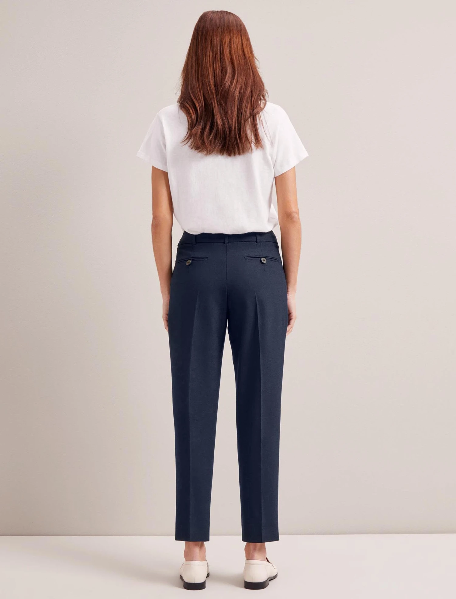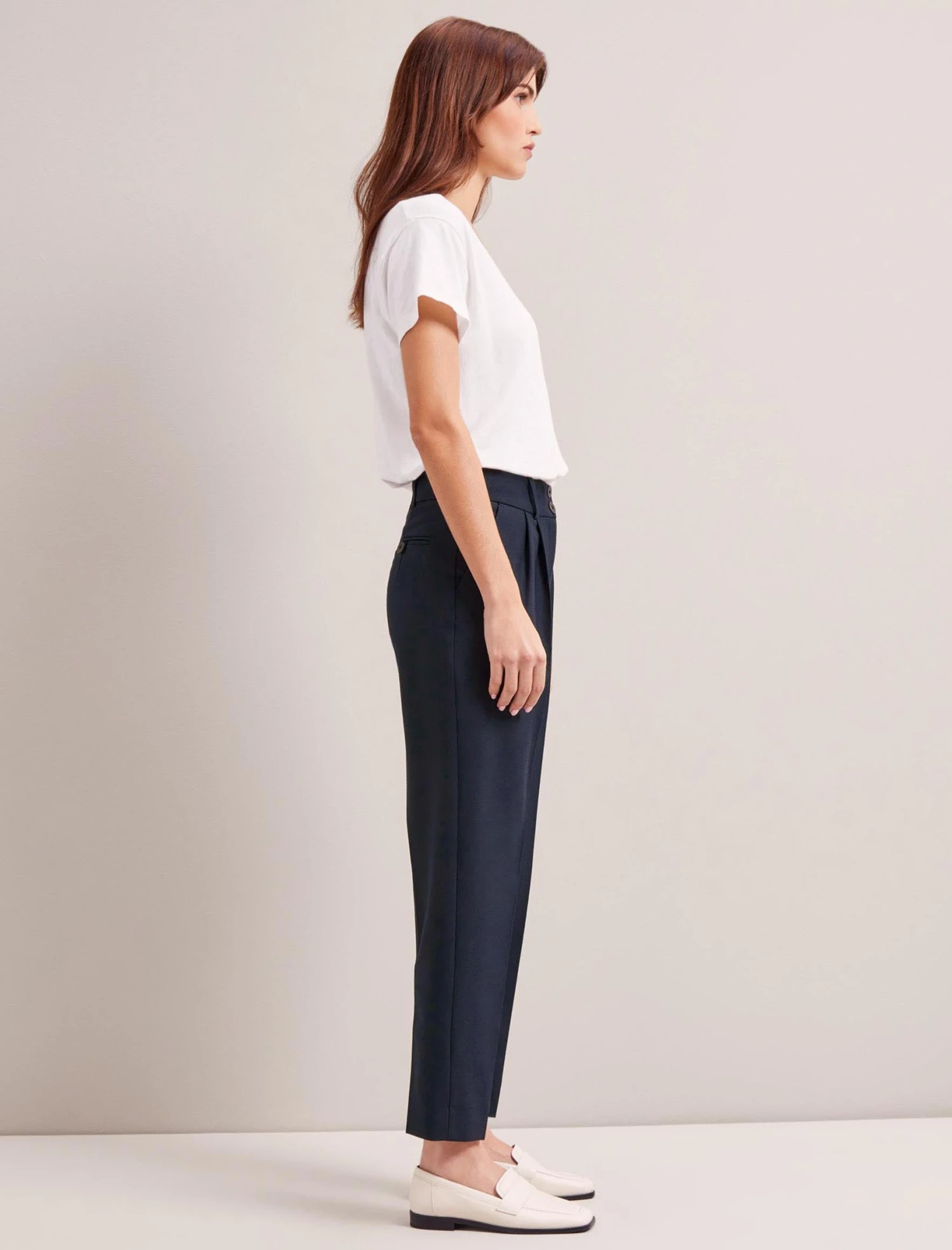 Tristan is an ankle-length, high-waisted trouser with elegant front pleats, side pockets and a double summary closure. Mix-and-match with a tailored jacket such as Jamie or your favourite knit or T-shirt, depending on the time of year.